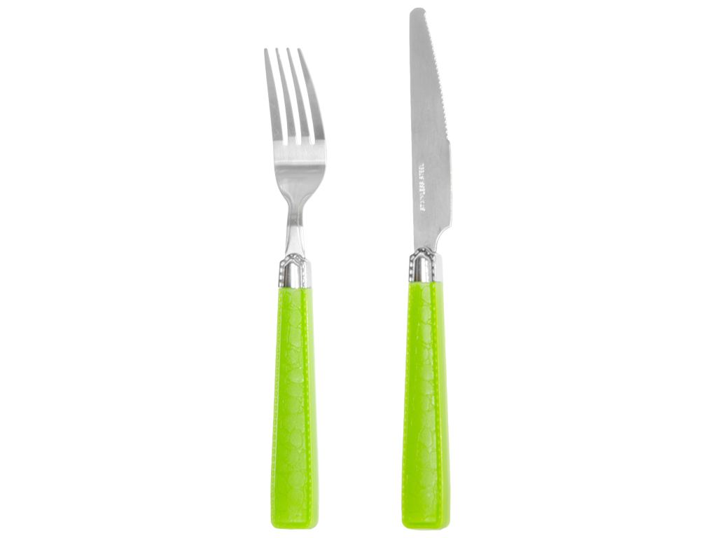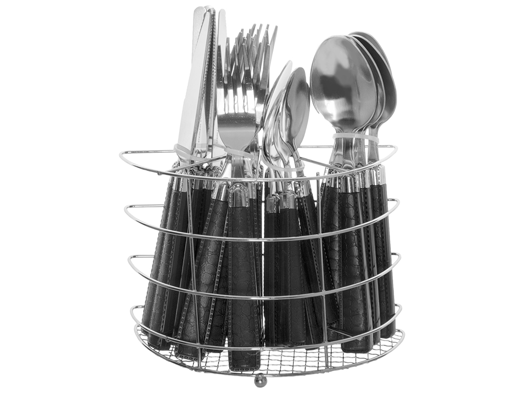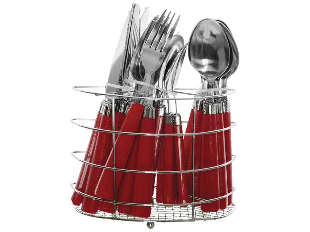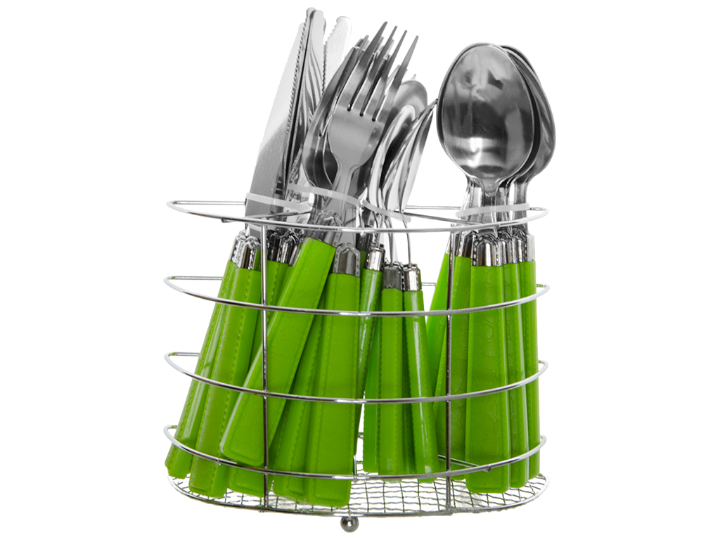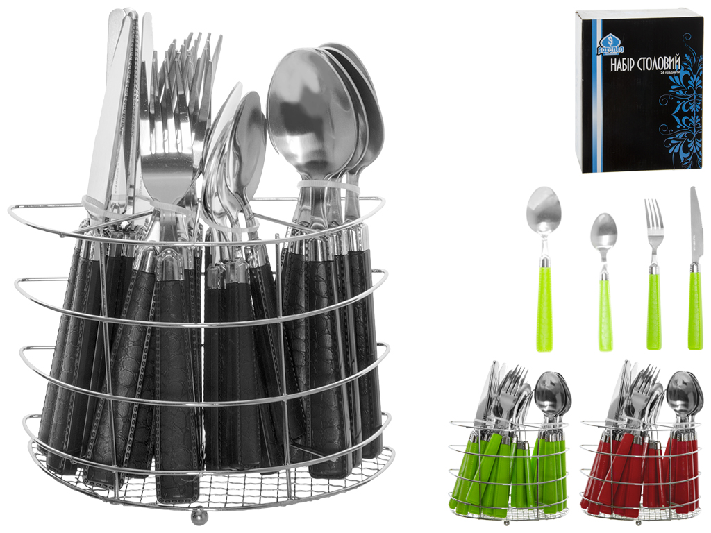 Количество предметов в упаковке: 25 с подставкой. Размеры: подставка под фраже 17х9х13см, столовая ложка 19,2х3,4, чайная ложка 16х3,2см, вилка 19,5х2,3см, нож 21х1,8см. Материал: нержавеющая сталь, пластик (ручки приборов). Транспортировочный размер (цветная коробка): 17,5х9х22,2см. Расцветки ручки ассорти: черный, салатовый, красный.