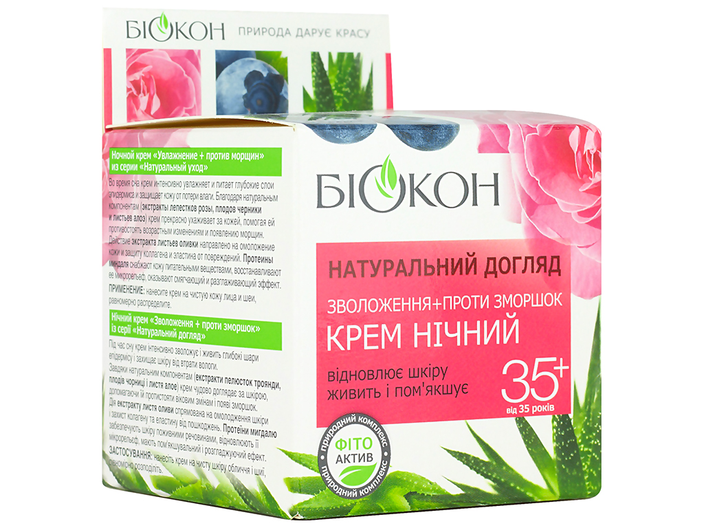 Ночной крем натуральный уход Увлажнение + против морщин 35+ Биокон. Объем: 50мл. Возраст: 35+. Время применения: ночной. Во время сна крем интенсивно увлажняет и питает глубокие слои эпидермиса и защищает кожу от потери влаги. Благодаря экстрактам лепестков розы, плодов черники и листьев алоэ крем прекрасно ухаживает за кожей, помогая ей противостоять возрастным изменениям и появлению морщин. Действие экстракта листьев оливки направлено на омоложение кожи и защиту коллагена и эластина от повреждений. Протеины миндаля снабжают кожу питательными веществами, восстанавливают ее микрорельеф, оказывают смягчающий и разглаживающий эффект.