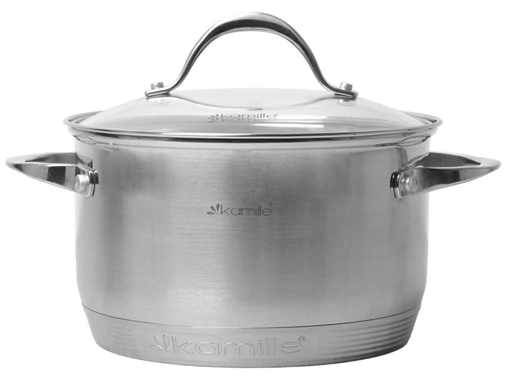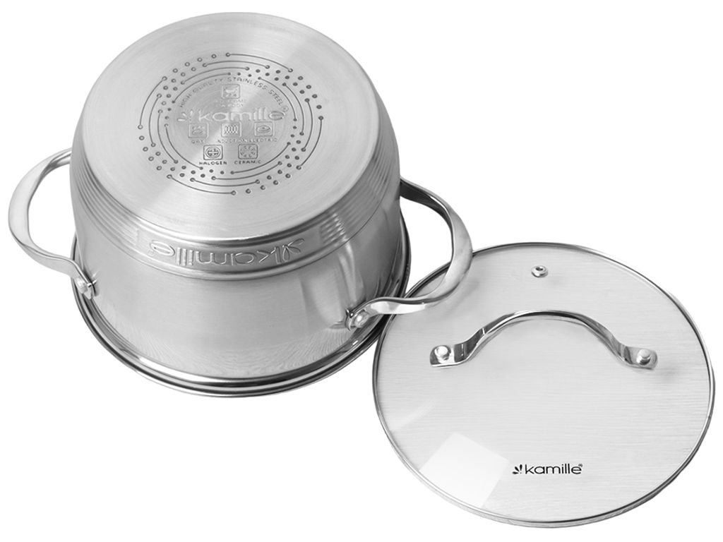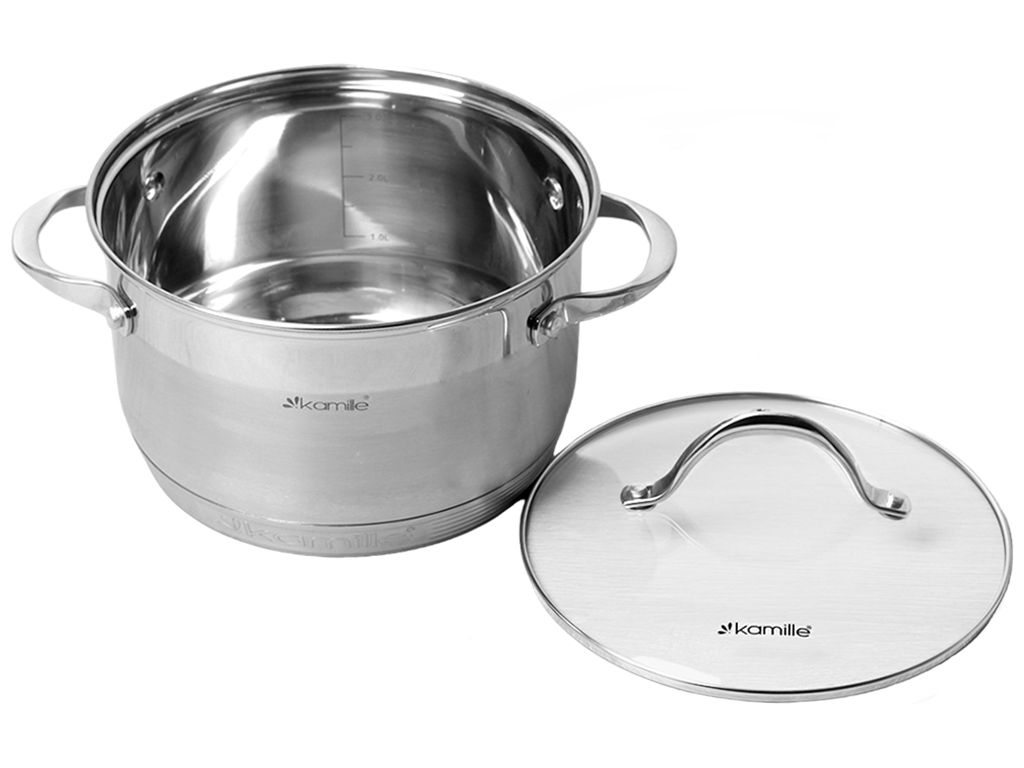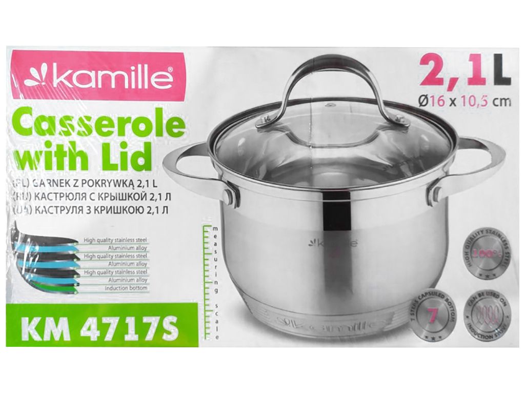 Кастрюля с крышкой Kamille. Материал: нержавеющая сталь. Внутренний диаметр: 16см. Высота: 10,5см. Объем: 2,1л. Крышка: жаропрочное стекло. Тип дна: 7-ми слойное. Мерная шкала: есть. Способ крепления ручек: клепочное соединение. Крышка с отверстием для выхода пара: да. Полировка металла: зеркальная/сатин. Тип плиты: электрическая, стеклокерамическая, индукционная, газовая. Подходит для мытья в посудомоечной машине: да. Упаковка: цветная картонная коробка.