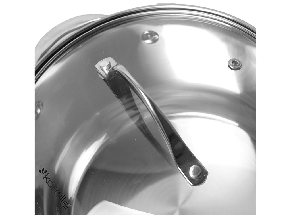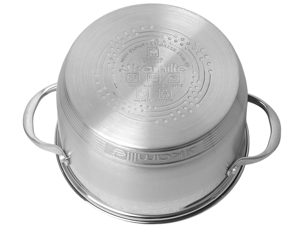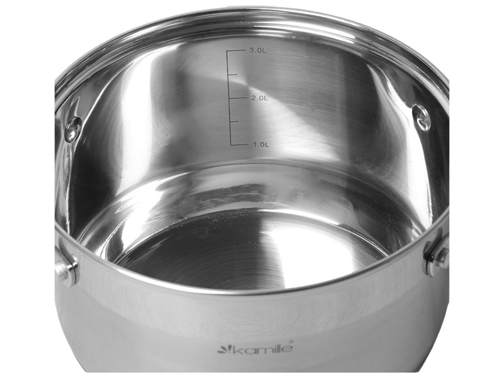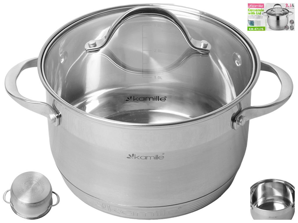 Кастрюля с крышкой Kamille. Материал: нержавеющая сталь. Внутренний диаметр: 16см. Высота: 10,5см. Объем: 2,1л. Крышка: жаропрочное стекло. Тип дна: 7-ми слойное. Мерная шкала: есть. Способ крепления ручек: клепочное соединение. Крышка с отверстием для выхода пара: да. Полировка металла: зеркальная/сатин. Тип плиты: электрическая, стеклокерамическая, индукционная, газовая. Подходит для мытья в посудомоечной машине: да. Упаковка: цветная картонная коробка.