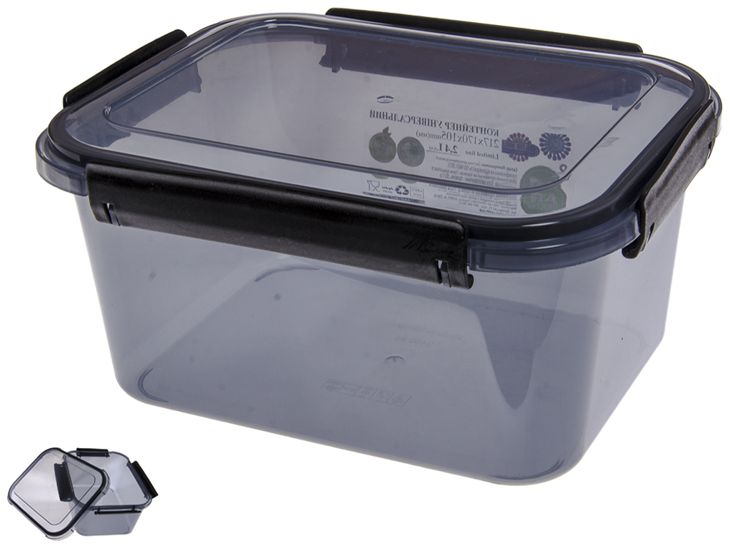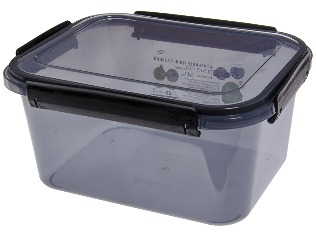 Размер контейнера: 21,7х17х10,5см. Объем: 2,4л. Материал: полипропилен. Крышка закрывается на замки защелки с 4 сторон. Для плотного закрытия крышка оснащена силиконовым уплотнителем. Контейнер прозрачный слегка окрашен пищевым красителем темного цвета. Контейнер предназначен для пищевых продуктов и организации хранения. Без упаковки.