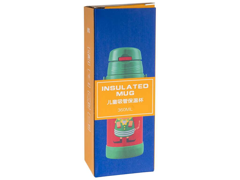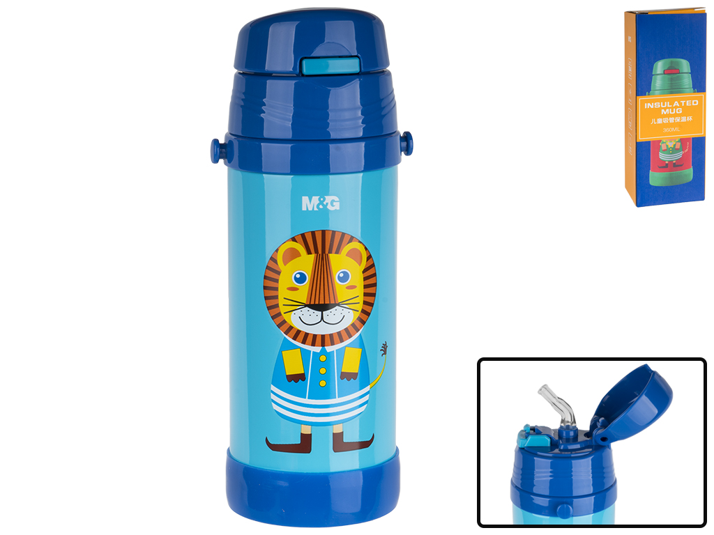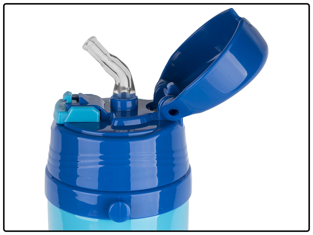 Объем: 350мл. Размер: 7х8,3х25,3см. Диаметр: 7,2см. Материал: нержавеющая сталь (корпус, колба), пластик (крышка), силикон (уплотнитель, трубочка). Цвет: голубой с синим. Длина трубочки 14см. Винтовая крышка с откидной крышкой на кнопке-замке. Съемный тканевой ремешок крепится к крышке петлей. Термос герметичен и имеет удобную поилку. Простота в очистке и уходе. Изолированный - вакуумный сосуд. Поставляется в коробке 7,5х7,5х21см.