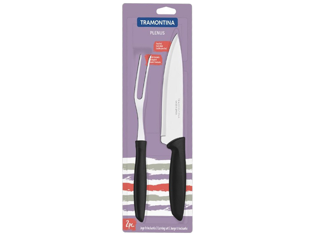 Набор Tramontina Plenus Black, 2 предмета. Комплектация: нож Шеф 1шт-17,8см, вилка для мяса 1шт. Материал лезвия: нержавеющая сталь AISI 420. Материал рукоятки: полипропилен. Режущая кромка ножа: гладкая. Упаковка: индивидуальный блистер. Количество в наборе: 2шт.
