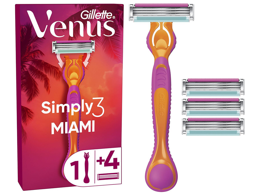 Бритва Gillette Simply Venus 3 Miami с 4 сменными картриджами обеспечивает тщательное бритье. Эти бритвы имеют головку с поворотным механизмом и 3 лезвиями для труднодоступных участков, а также смазывающую полоску для лучшего скольжения. В комплект входит удобная ручка бритвы и четыре сменных картриджа, позволяющих обеспечить долговременный результат. Благодаря смазывающей полоске, кожа сохраняет увлажнение и не становится сухой после бритья.