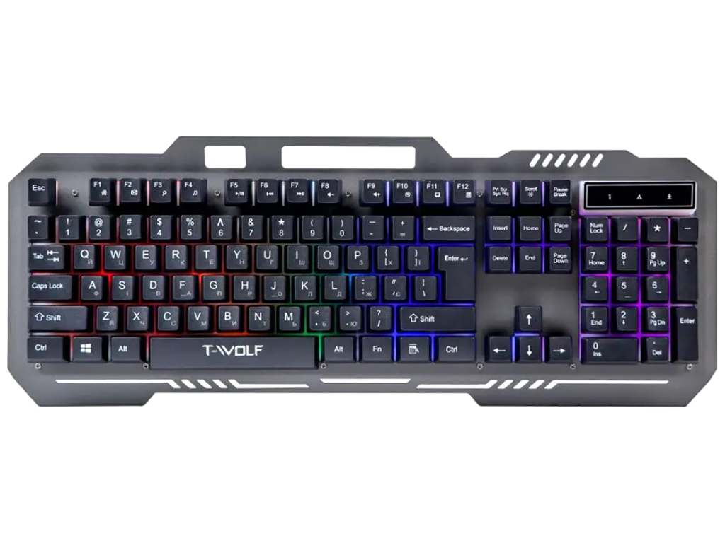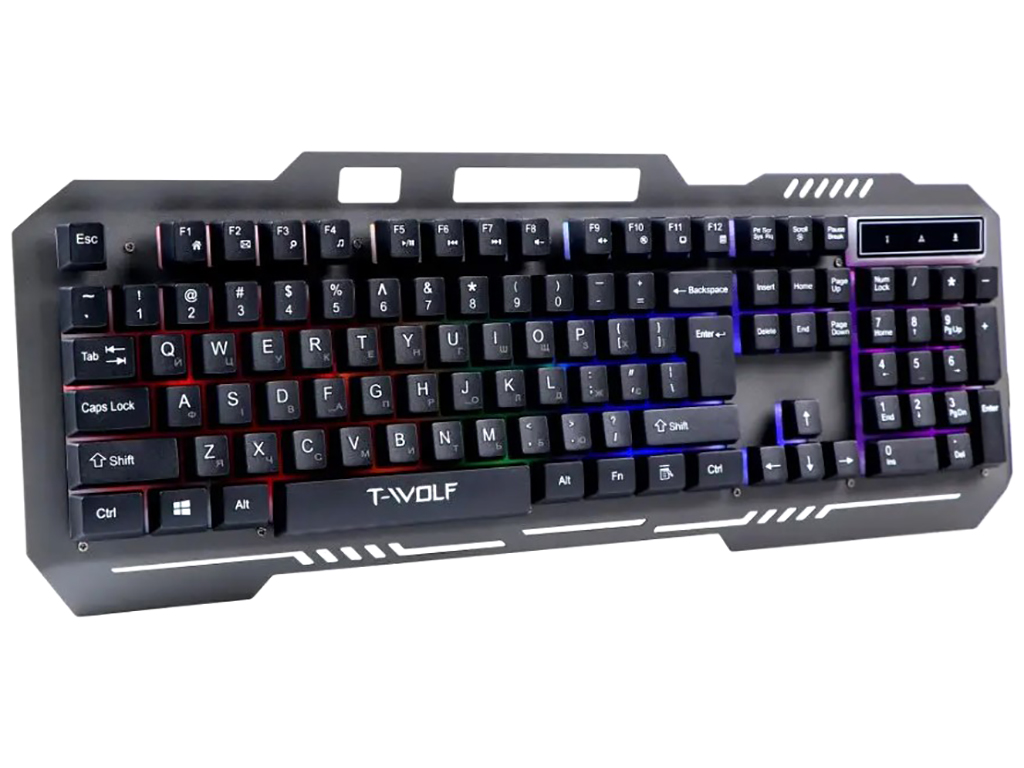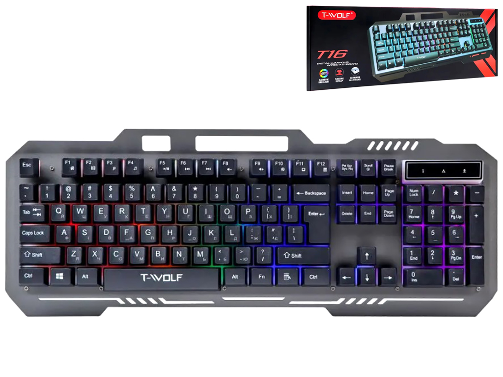 Игровая клавиатура TWolf T16 – это современное, надёжное устройство, которое удовлетворит потребности как начинающих, так и опытных геймеров. Модель привлекает внимание технологичным дизайном с практичными, функциональными деталями и градиентной RGB LED подсветкой. Она лаконично дополнит как игровое, так и рабочее пространство. Корпус клавиатуры качественно собран, защищён от воды и пыли, что гарантирует защиту внутренних электронных компонентов и длительный срок службы. Её верхняя панель изготовлена из металла, дополнена декоративной перфорацией на изогнутых краях и вырезом с защитной рамкой для удобной установки смартфона в вертикальном положении. На её нижней пластиковой панели находятся складные подставки и противоскользящие накладки.