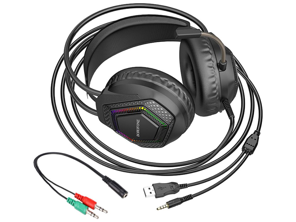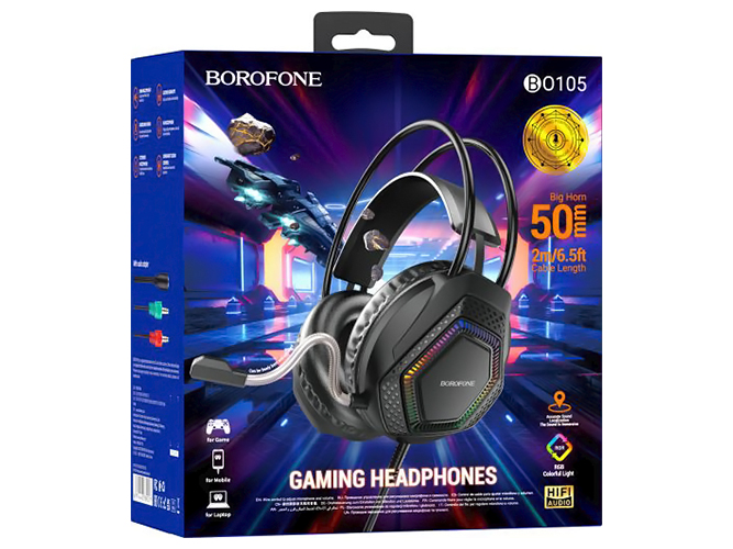 Игровые наушники Borofone BO105 Thunder - это полноразмерная компьютерная гарнитура, которая удовлетворит потребности даже самых требовательных геймеров и меломанов. Модель имеет небольшой вес и практичную конструкцию, привлекает внимание стильным, футурстичным дизайном, дополненным оригинально реализованной RGB подсветкой. Её мягкие амбушюры обшиты приятным на ощупь кожзамом, плотно прилегают к ушам и надежно защищают от окружающего шума, благодаря своей эргономичной форме и достаточно жесткому ободу из двух прочных дуг. Саморегулируемая, эластичная накладка делает аксессуар максимально комфортным для каждого, независимо от формы и размера головы. За воспроизведение мощных, глубоких басов, насыщенных средних и чистых высоких частот отвечает современный звуковой процессор и большие драйвера диаметром 50мм. На одном из ушных элементов устройства находится регулятор громкости, микрофон на гибкой ножке, который реалистично передает речь, и выход встроенного кабеля с разъёмами Mini-Jack 3.5мм и USB. Длина кабеля составляет 2м. В комплект к гарнитуре входит переходник - адаптер AUX (female) - 2xAUX (male) для раздельного подключения микрофона и наушников.