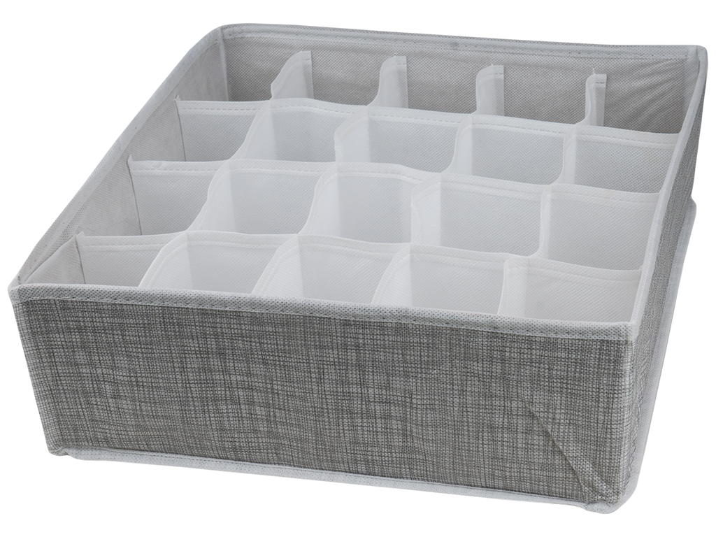 Размер: 32х32х12см. Материал: картон, ПВХ. Тип: ящик-органайзер для хранения белья. 20 отделений для хранения. Упаковка: полиэтилен. Расцветки ассорти. В сложенном состоянии достаточно компактен и не будет занимать много места. Собрать его очень легко, всего несколько движений и у вас стильный и вместительный ящик для хранения вещей.