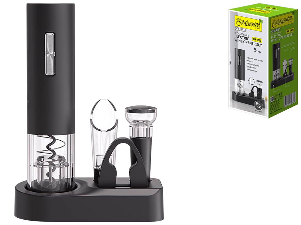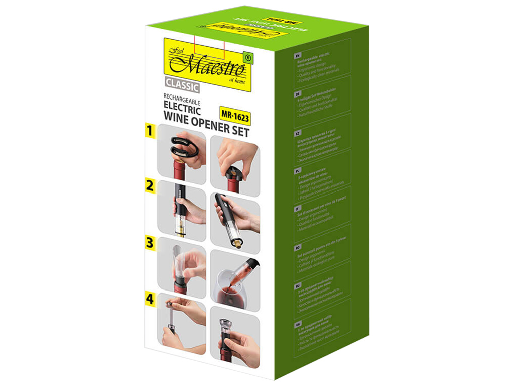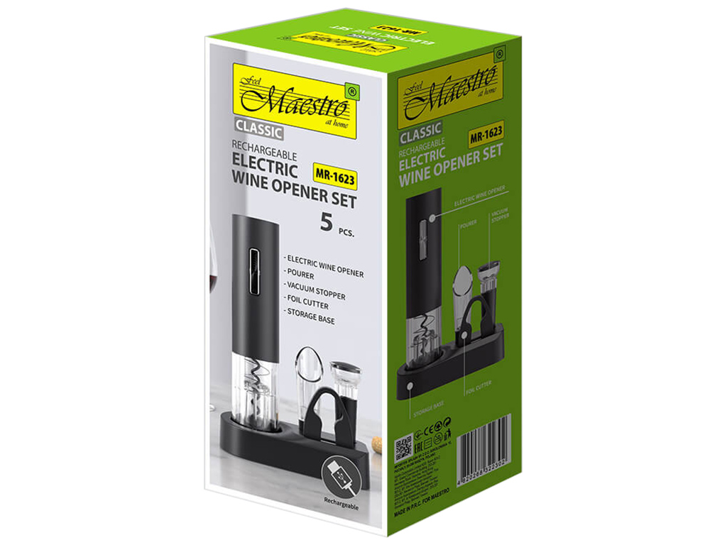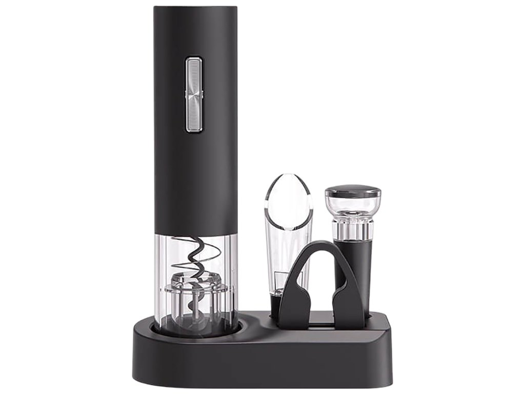 Набор предназначен для открытия, разлива и хранения вина. Состав: автоматический штопор, дозатор-аэратор, вакуматор, нож для фольги, подставка для хранения. Аккумулятор NiMh 3.6V 500 mAh; входное напряжение: 5V. USB кабель в комплекте. Материал: пластик.