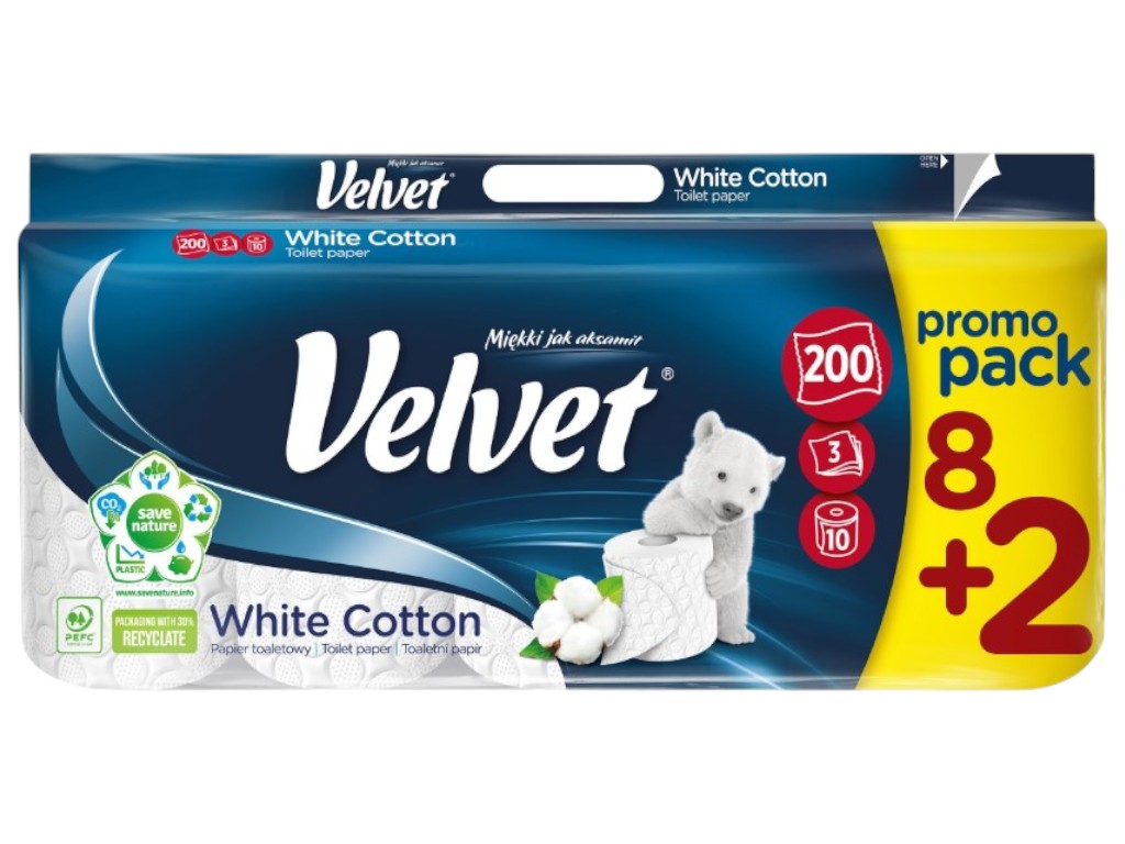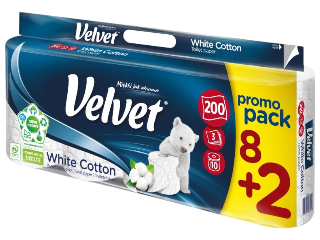 Бумага туалетная Velvet White Cotton обладает высокой мягкостью и прочностью, а также нежным и стильным рисунком, что придает элегантный вид в вашем туалете. Бумага состоит на 100% из целлюлозы и обладает хорошей впитываемостью, что делает её идеальной для повседневного использования. Каждый рулон включает 200 листков, а упаковка содержит 10 рулонов, что позволяет использовать её надолго. Velvet White Cotton — это выбор для тех, кто ценит комфорт, высокое качество и стиль в повседневной жизни.