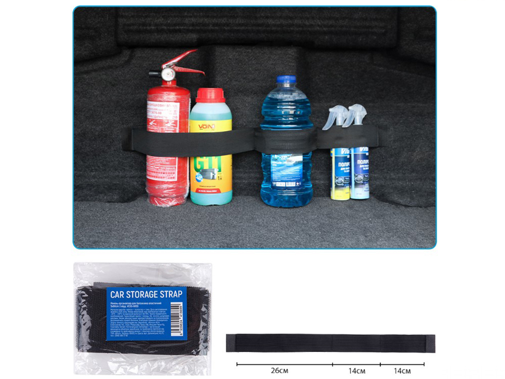 Когда в багажнике нужно держать несколько емкостей и предметов одновременно, ремень-органайзер помогает разместить их аккуратно и без риска падения. Три отделения дают возможность разложить огнетушитель, канистру с жидкостью, бутылку или аэрозоль так, чтобы каждая вещь находилась на своем месте. Эластичная основа охватывает предметы и удерживает их в фиксированном положении. Органайзер крепится к обшивке на липучку, и это удобно: при необходимости его можно снять и переставить в другое место. Такое решение особенно ценно для тех, кто часто возит в багажнике разные жидкости и аксессуары — антифриз, автошампунь, очистители стекол, полироли. В отличие от пластиковых ящиков или сумок, ремень занимает минимум места и не мешает перевозке крупного багажа. Если автомобиль используется для дальних поездок, такой аксессуар помогает держать порядок: емкости остаются на своих местах даже при активном движении по трассе или грунтовке.