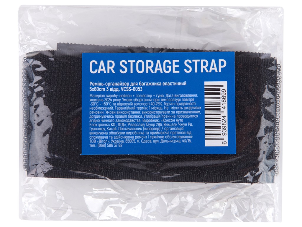 Ремень-органайзер Vitol, для багажника, эластичный, липучка, 3 отделения, 5×60см, цвет черный