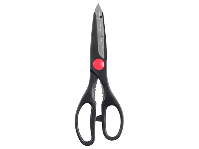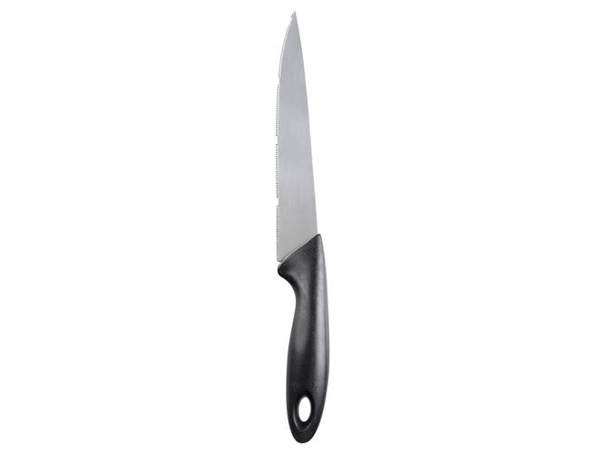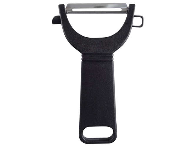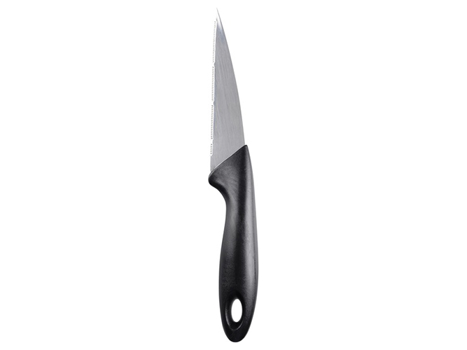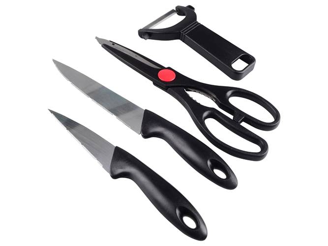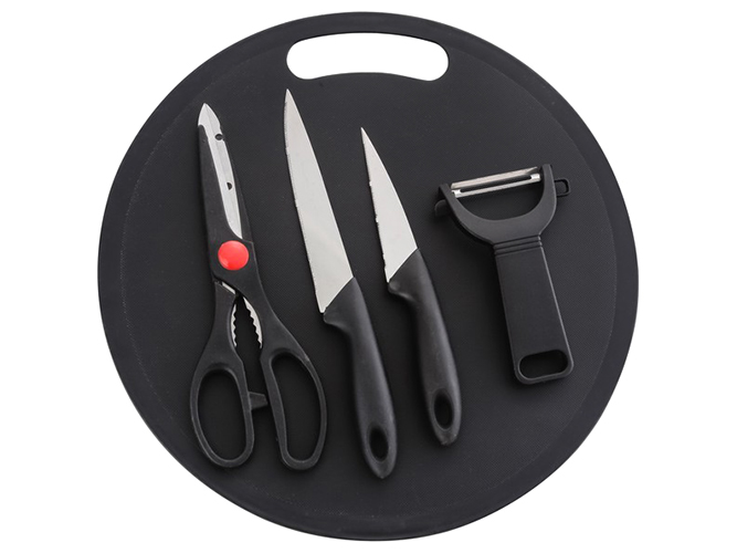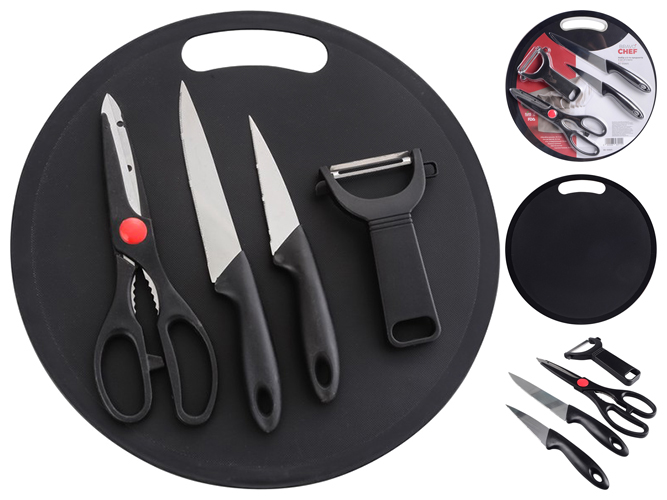 Лезвия ножей, ножниц и овощечистки изготовлены из нержавеющей стали. Ручки ножей, ножниц и овощечистки сделаны из пластика. Разделочная доска изготовлена из пластика. Все предметы имеют проем для удобного хранения на крючках. В набор входят: нож для овощей; нож универсальный; овощечистка горизонтальная; ножницы кухонные; разделочная доска.