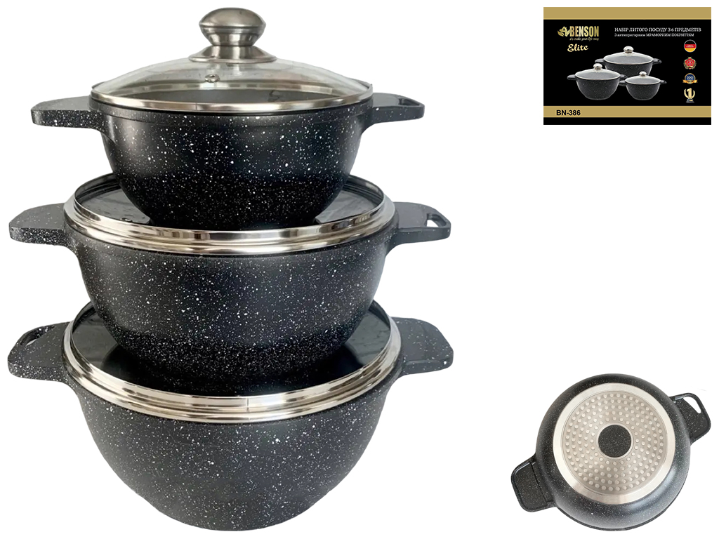 Набор кастрюль (казанов) Benson, антипригарное  мраморное покрытие, 2,4л, 4,6л, 5,6л (индукция)