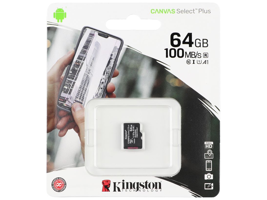 Карта памяти Kingston Canvas Select Plus microSDXC (UHS-1) 64gb 10 Class - это производительный, высокоскоростной носитель информации, разработанный с использованием современных технологий. Она поможет увеличить память на 64Гб совместимых с ней навигаторов и камер, станет отличным дополнением к смартфонам и планшетам под управлением ОС Android. Карта соответствует рейтингу А1, который отображает показатель IOPS (операций ввода/вывода в секунду) при чтении и записи не ниже 1500 и 500 соответственно. Ее интерфейсная шина UHSI категории U1 гарантирует минимальную скорость записи данных на уровне 10МБ/с , при этом скорость чтения может достигать 100МБ/с. Класс видео V10 позволяет без задержек записывать видео в формате Full HD прямо на карту с минимальной гарантированной скоростью 10МБ/с. Аксессуар изготовлен с использованием электронных компонентов и качественных материалов, прошел испытания в самых экстремальных условиях, которые подтвердили высочайший уровень защиты помещённых на него данных.