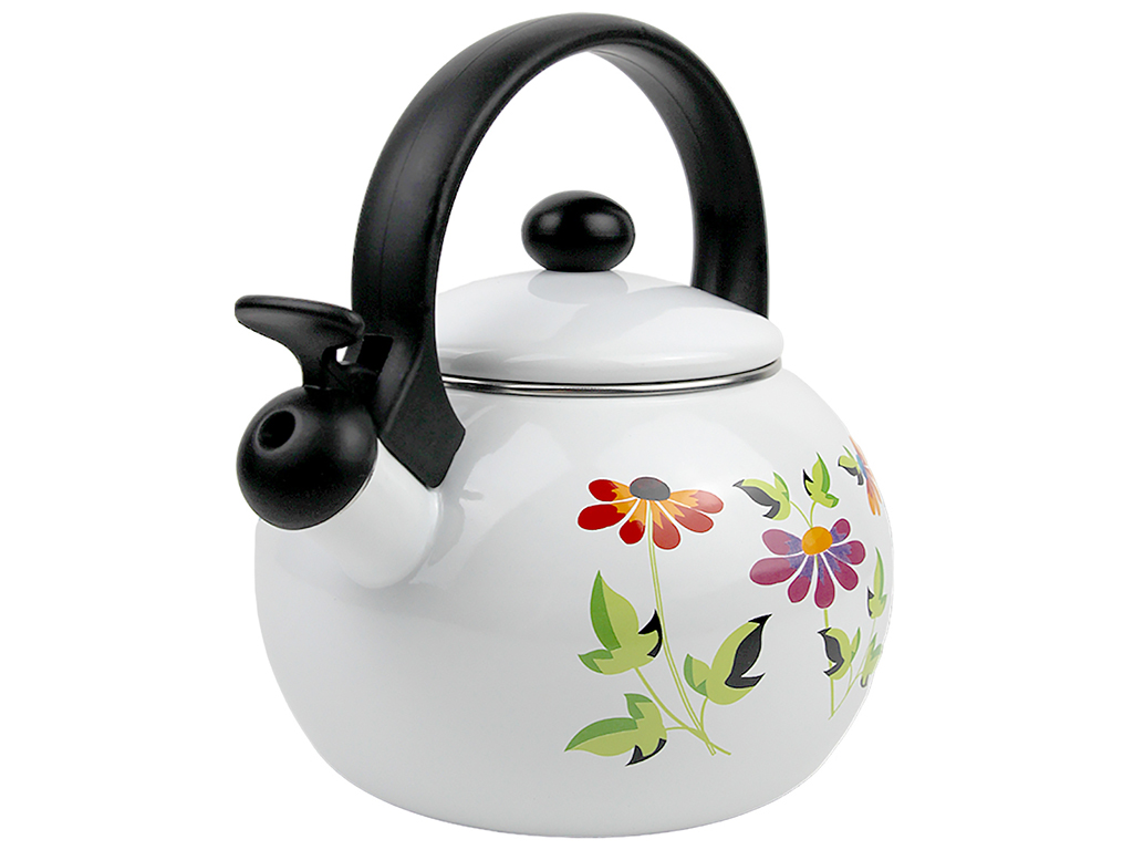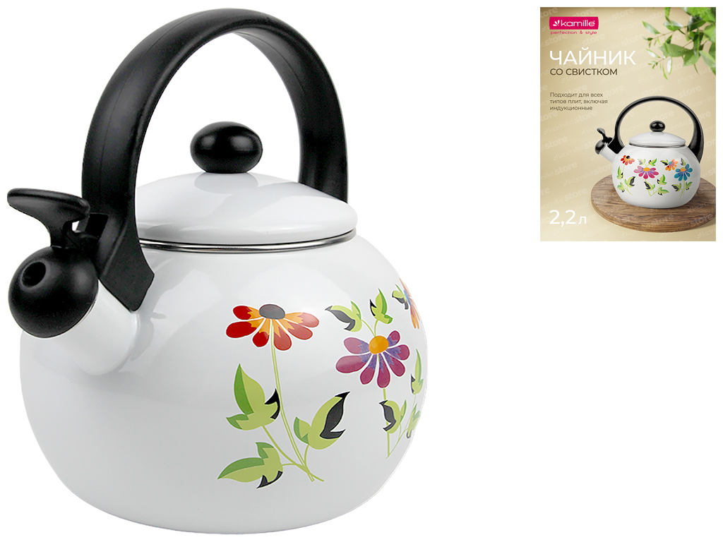 Материал чайника и крышки: высококачественная сталь покрытая эмалью. Общий объем: 2,2л. Высота с ручкой: 21см. Диаметр: 18см. Цвет чайника: белый с рисунком "цветы". Тип ручки: фиксированная. Материал ручки: бакелит. Цвет ручки: черный. Свисток: есть. Подходит для индукционных плит. Подходит для мытья в посудомоечной машине. Упаковка: цветная картонная коробка.