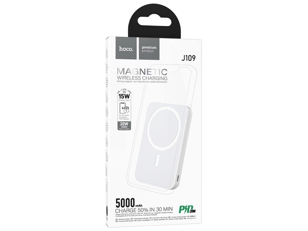 Power Bank Hoco J109 Easy – это невероятно компактный внешний аккумулятор, разработанный для быстрой, комфортной зарядки портативных гаджетов. Модель выделяется поддержкой проводной и беспроводной зарядки (Qi), технологии MagSafe и протоколов PD2.0/3.0, QC2.0/3.0, FCP и AFC. Такой широкий функционал делает его отличным выбором для зарядки современных смартфонов, iPhone 12 и новее, а также других совместимых устройств, например планшетов и зарядных кейсов беспроводных гарнитур. Благодаря небольшим размерам он с легкостью поместится даже в кармане и не будет мешать полноценному использованию iPhone во время зарядки.