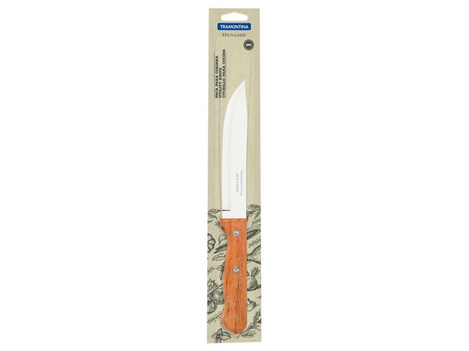 Нож Tramontina Dynamic 15,2см. Лезвия ножей подвергаются термической обработке, что приводит к высокой прочности режущей кромки. Материал лезвия: нержавеющая сталь. Материал ручки: дерево. Режущая край ножа: гладкая. Цвет: дерево. Назначение ножа: повар. Нельзя мыть в посудомоечной машине. Размер: 27,9х1,45х2,91см.