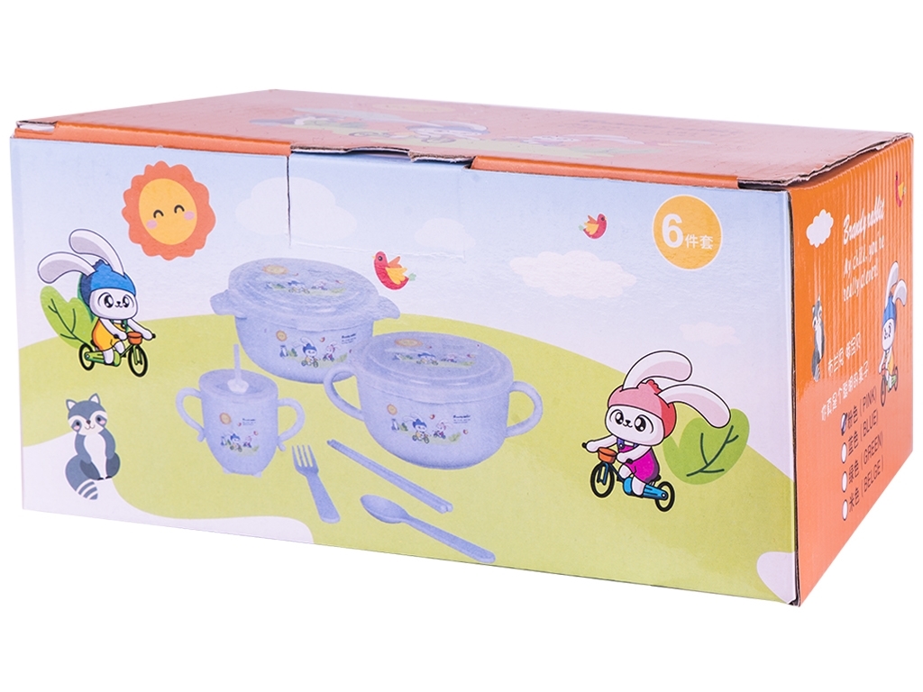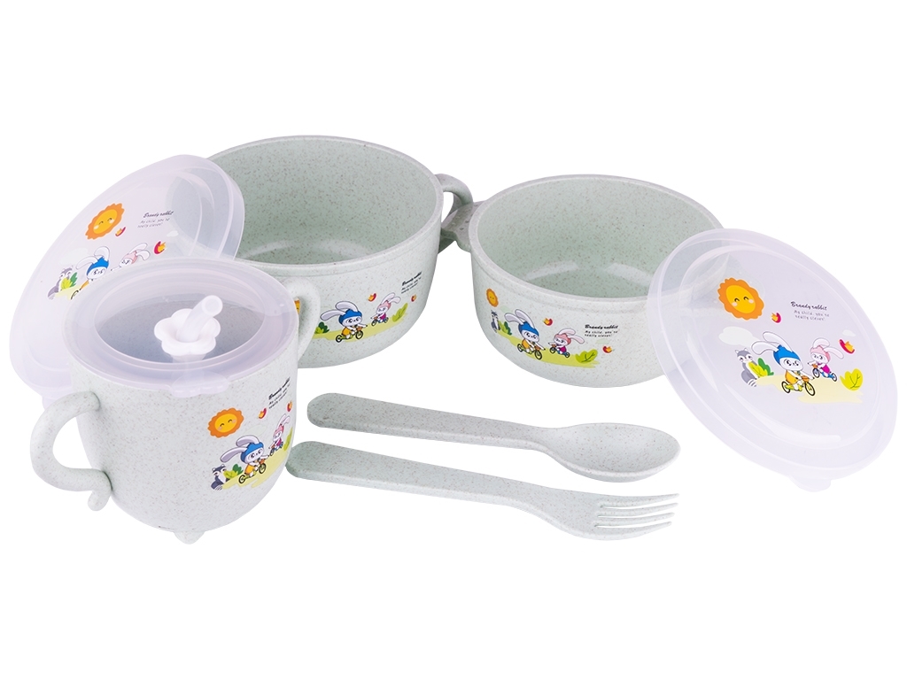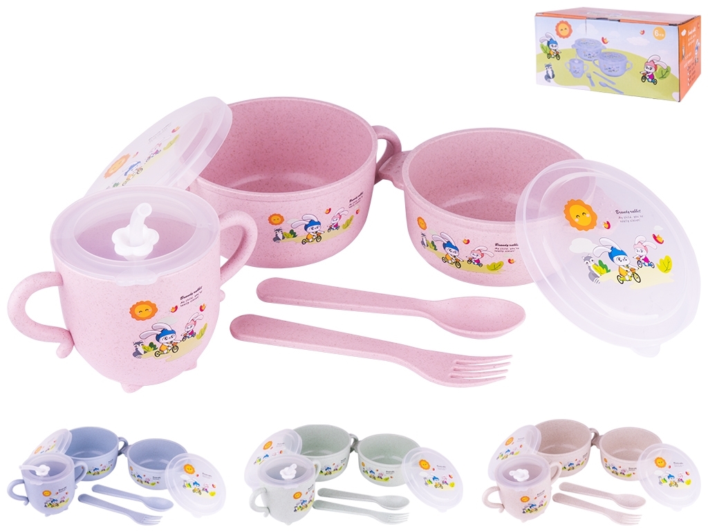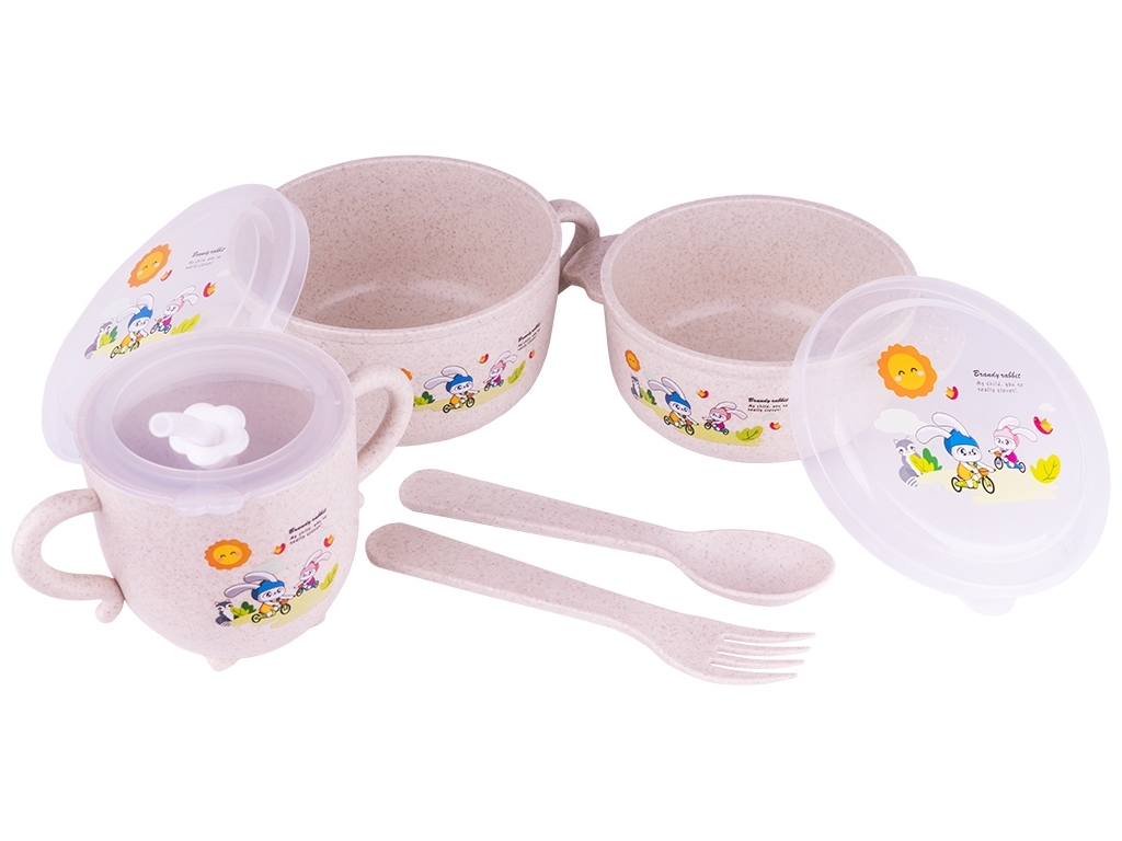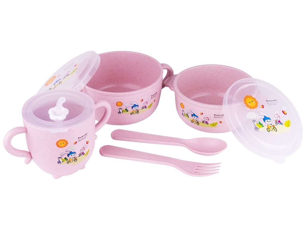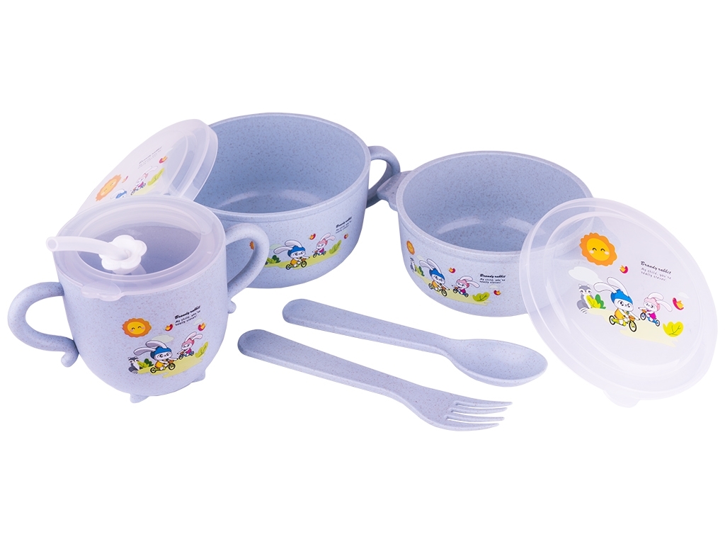 Набор детской посуды 8 предметов (2 супницы с крышкой, чашка с крышкой, ложка, вилка). Содержит: 2 супницы 16х12,3х6,5см, 14х11,5х5,5см, чашка 13х8х8см, вилка 14,8х2,4см, ложка 14,8х3,2см. Цвета: розовый, голубой, бежевый, бирюзовый. Состоит из безопасных органичных компонентов природного происхождения. Материал: пшеничная шелуха. Можно мыть в посудомоечной машине.