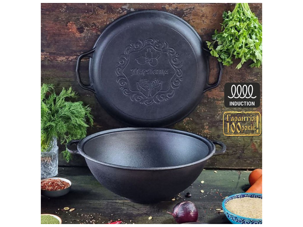 Казан узбекский WOK с крышкой-сковородой Maysternya, чугун, 8л, цвет черный