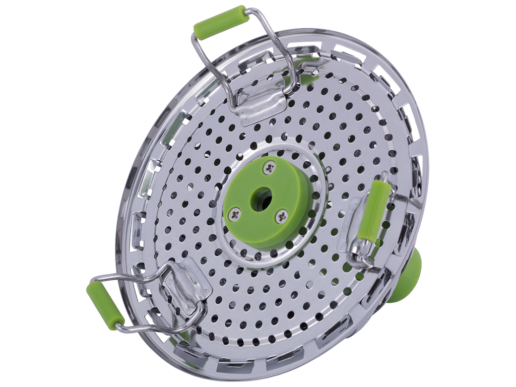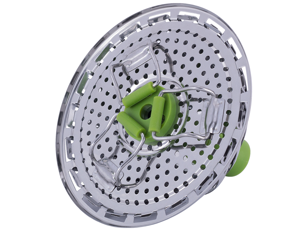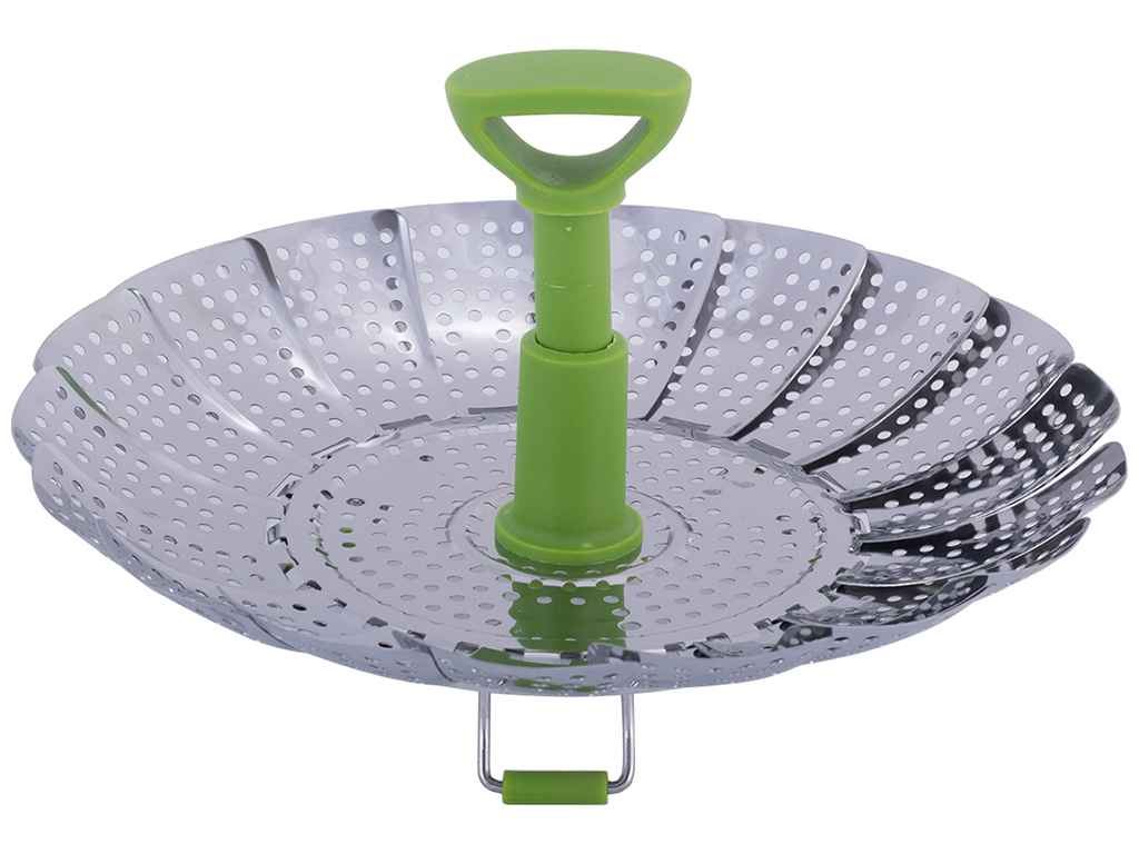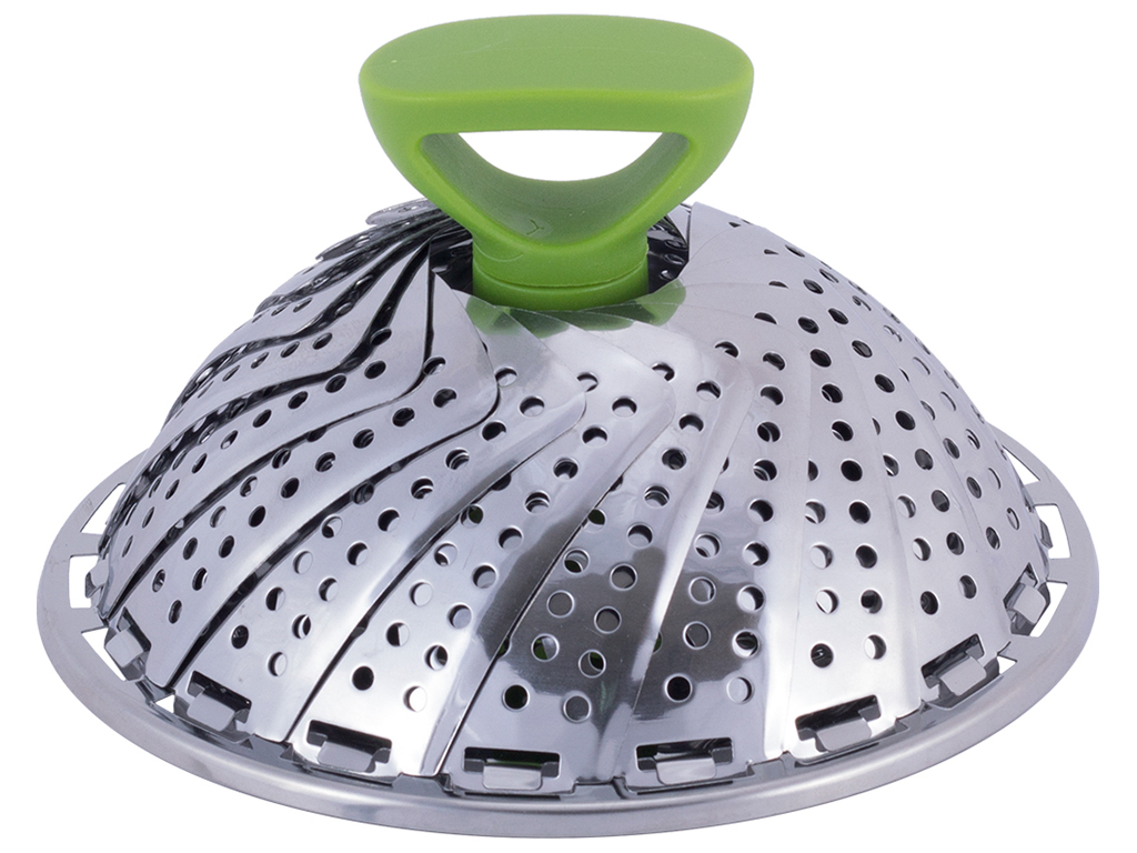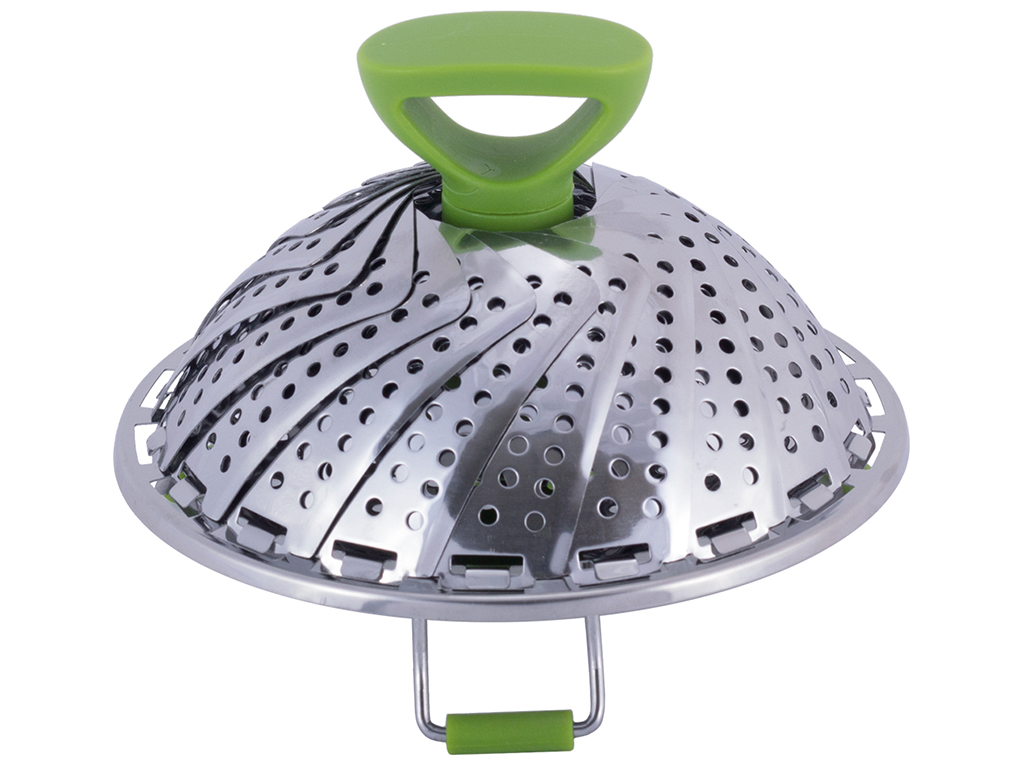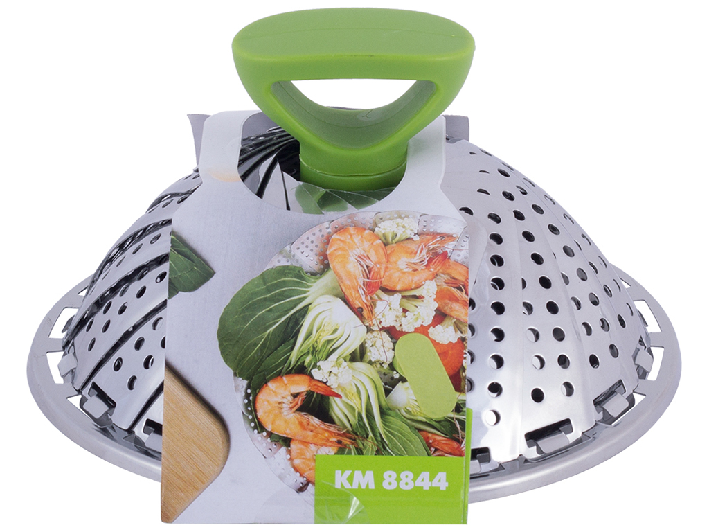 Пароварка Kamille. Материал: нержавеющая сталь. Материал ручки: пластик, силикон (на ножках). Высота: в сложенном виде 8,5см, в расложенном виде 13см. Диаметр: от 13,8см до 23см. Способ крепления ручки: винтовое. Тип плиты: электрическая, стеклокерамическая, индукционная, газовая. Подходит для мытья в посудомоечной машине: да. Упаковка: картонная накладка, пэ-пакет.