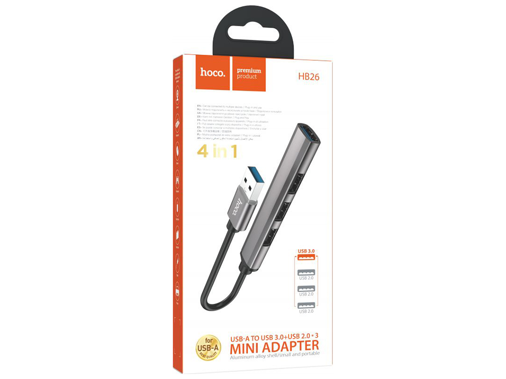 USB Hub Hoco HB26 4 in 1 - это практичный, компактный аксессуар, который поможет увеличить количество USB портов ноутбука или настольного компьютера. Модель реализована в стильном, современном дизайне, обладает небольшими размерами и весом, поэтому не займет много места на столе или в сумке для ноутбука. Надежно собранный корпус устройства выполнен в эргономичной форме, имеет приятную на ощупь поверхность, изготовлен из сверхпрочного алюминиевого сплава, который убережет его внутренние электронные компоненты от негативного внешнего воздействия и способствует эффективному отводу тепла. В одном из торцов хаба находится выход встроенного кабеля длиной 13см с интерфейсом USB3.0 типа male для подключения к компьютеру, в другом - порт USB3.0 (female), а на одной из его боковых граней расположены 3 порта USB2.0 (female). Таким образом, данный аксессуар поможет подключить к одному разъему для полноценного использования сразу 4 устройства, например: мышку, клавиатуру, картридер и внешний накопитель объемом до 1Тб.