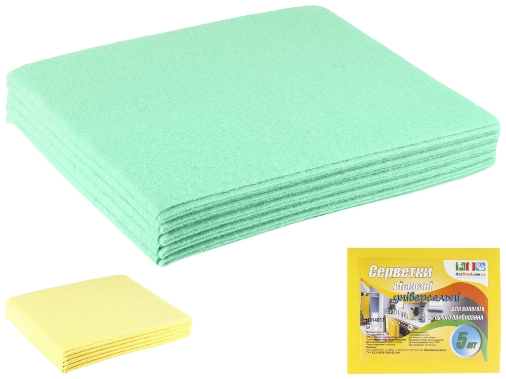 Количество: 5шт. Размер: 30х36,5см. Салфетка вискозная для мытья, обладает отличными моющими свойствами. Идеально впитывает воду и грязь. Может использоваться с моющими средствами. Прочная, для многократного применения. Цвета: желтый, бирюзовый.