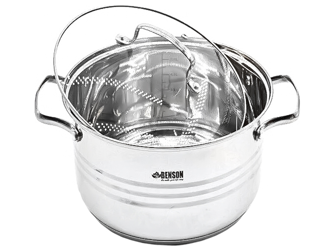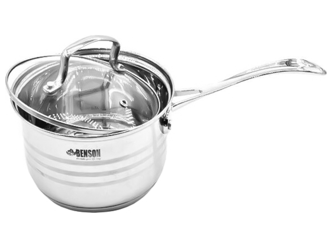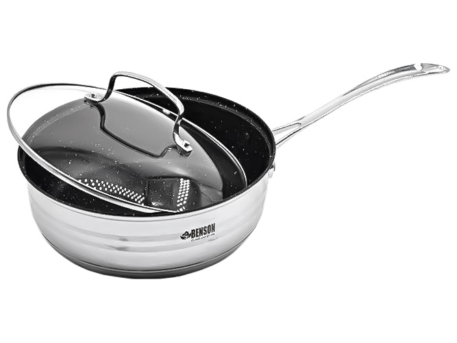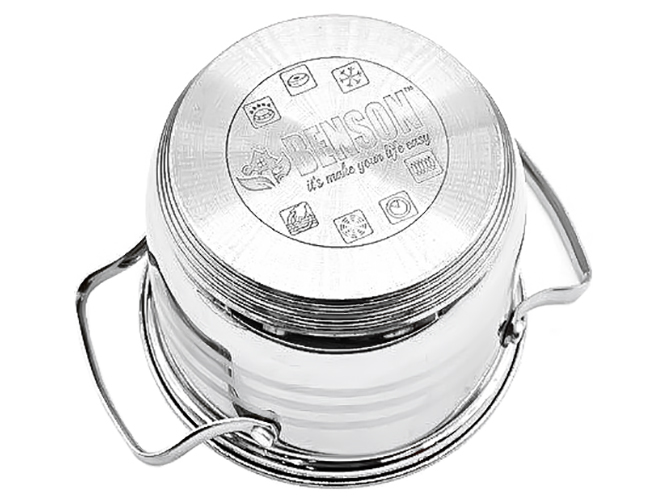 Набор посуды Benson, из тяжелой высококачественной нержавеющей стали. Сковорода с мраморным покрытием. Посуда имеет 5-слойное дно. Есть мерная шкала. Подходит для всех кухонных плит. Количество предметов в наборе: 12шт. В набор входит: кастрюля с крышкой - 4шт (объемы кастрюль 2,1л, 2,9л, 3,9л, 6,5л), ковш с крышкой - 1шт (2,1л), сковорода с крышкой - 1шт (24х7,5см).