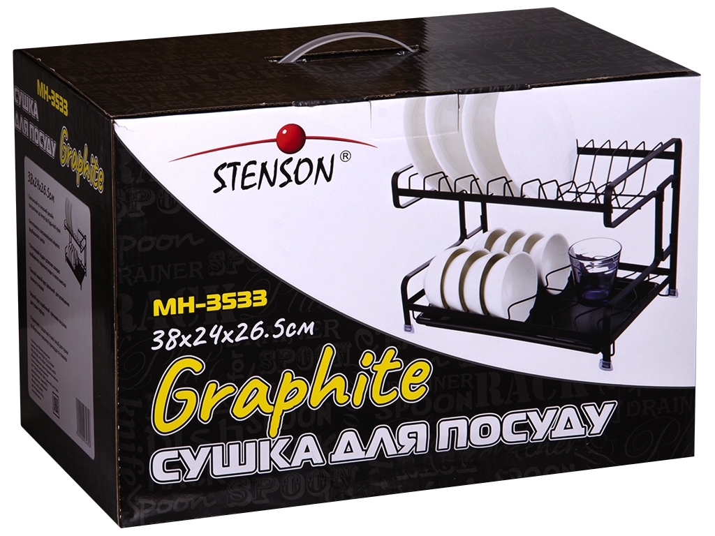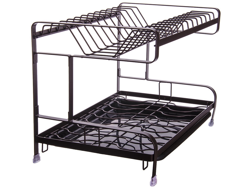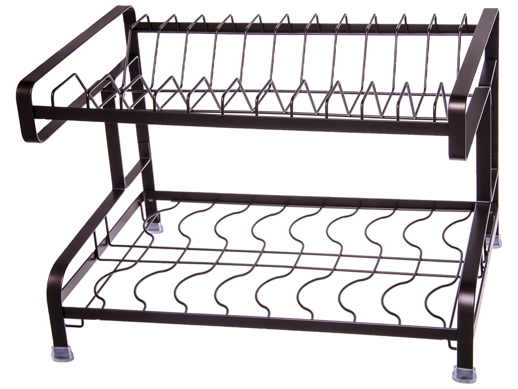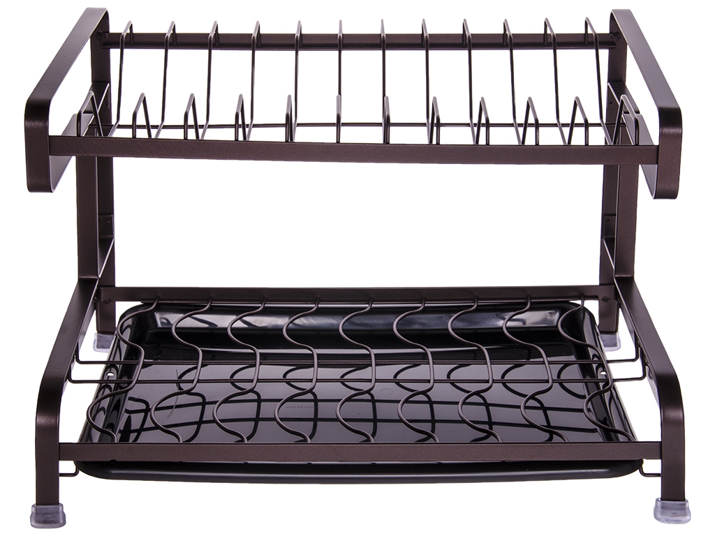 Комплектация: сушилка 1шт, поддон съемный 1шт, съемные силиконовые накладки на ножки 4шт. Размеры: 38х24х26,5см (+-1см), размер поддона 35х25х2см, высота нижнего яруса до отдела с тарелками 16см. Верхний ярус под 11 тарелок. Нижний ярус можно использовать для чашек стаканов и другой посуды, на верхнем удобно располагать тарелки и крышки. Материал: железо окрашенное (сушилка), пластмасса (поддон), силикон (накладки на ножки). Цвет поддона черный, цвет сушилки коричневый. Упаковка: цветная коробка 40х25х26,5см.