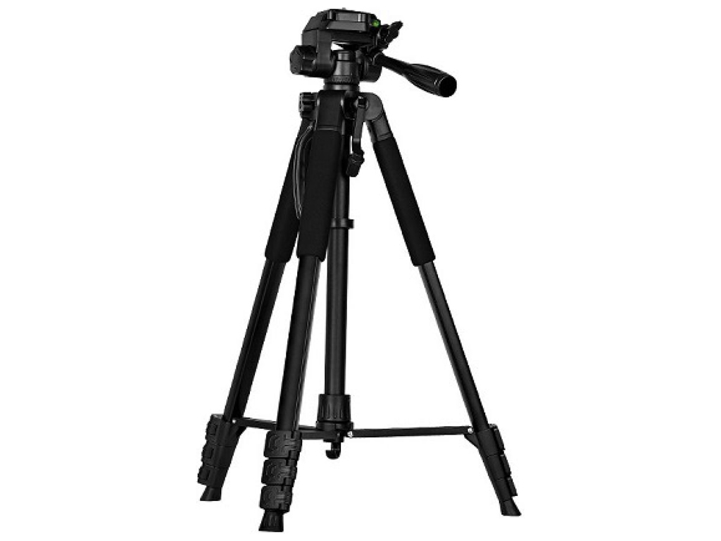Телескопическая конструкция позволяет быстро изменять высоту съемки и стабильно фиксировать положение камеры или смартфона. Ноги с квадратным профилем выполнены из алюминиевого сплава, секции блокируются фиксаторами, на опорах установлены резиновые наконечники для стойкости на гладких поверхностях. Центральная колонна имеет подъемный механизм с рукояткой для плавного поднятия, предусмотрен крюк для навешивания дополнительного груза, а также боковая ручка для переноски. Трехмерная голова оборудована рукояткой управления, пузырьковым уровнем и резьбой площадкой 1/4 дюйма, подходящей для большинства фотокамер и видеокамер; при необходимости используется комплектный держатель смартфона. В сложенном состоянии штатив занимает 53 см, поэтому его удобно переносить в сумке-чехле из комплекта. Такая компоновка включает базовые сценарии фото- и видеосъемки: статические кадры с фиксированным горизонтом, панорамные повороты, наклоны для съемки с верхней точки. Для корректной эксплуатации важно проверять блокировку секций после смены высоты и избегать перегрузки крюка нештатными весами.