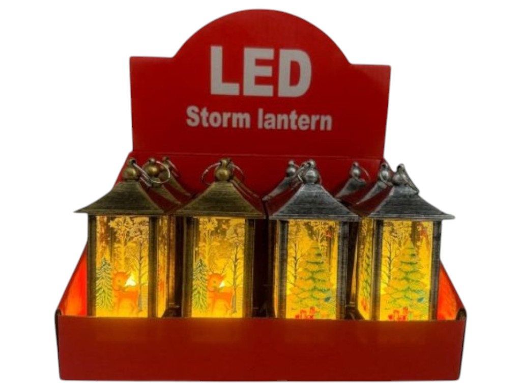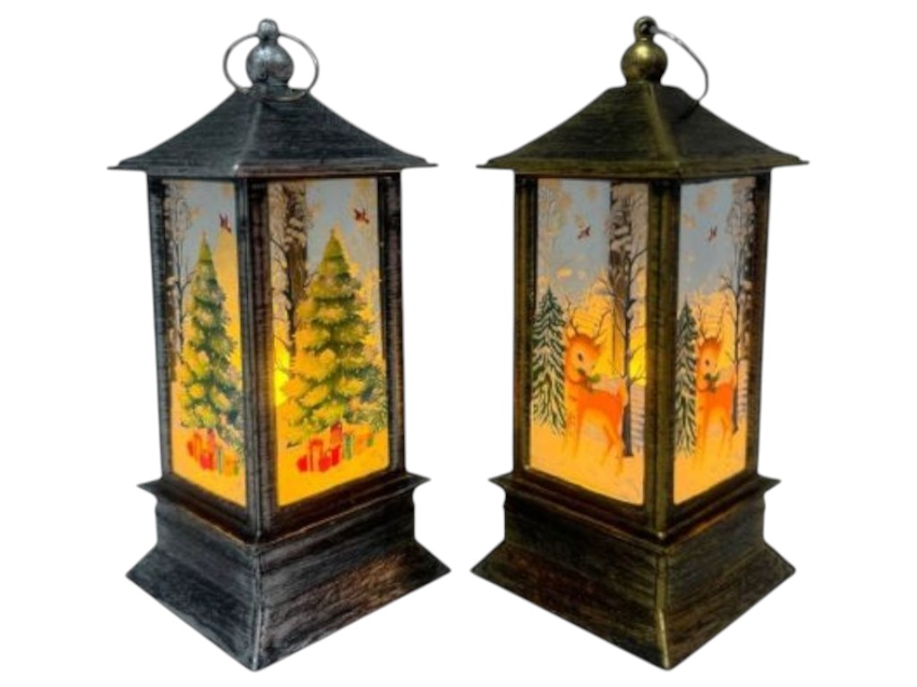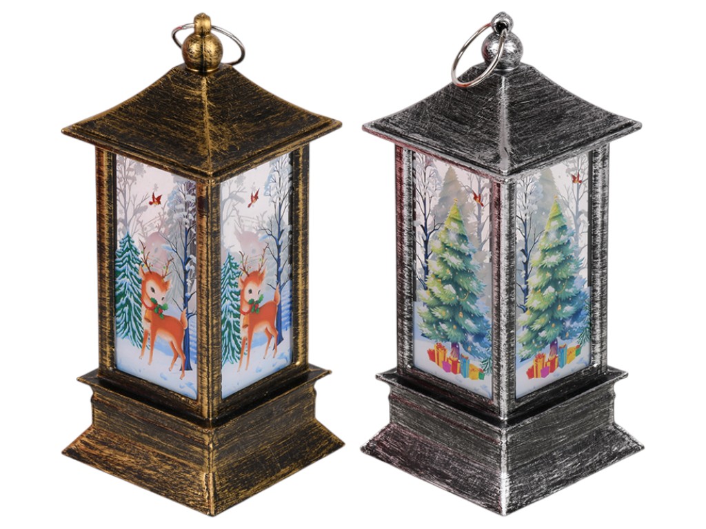 Компактный декоративный фонарь с новогодним оформлением оснащён светодиодной подсветкой и переключателем на основании корпуса. Работает от батареек, которые входят в комплект, подходит для размещения на полке, праздничном столе или в композиции с декором.