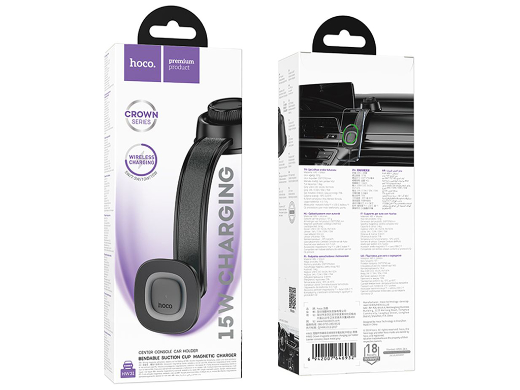 Автодержатель Hoco HW31 предназначен для фиксации смартфона в салоне автомобиля с одновременной поддержкой беспроводной зарядки по стандарту Qi. Оснащенный мощным кольцевым магнитом, он совместим с iPhone 12-16 и другими моделями, имеющими встроенные магниты или поддерживающими дополнительное кольцо из комплекта. Конструкция изготовлена из прочного ABS-пластика с дополнительными элементами из силикона, что обеспечивает устойчивость к ежедневной нагрузке. Благодаря наличию гибкой плоской ножки и шарового соединения пользователь может настроить высоту, угол обзора и ориентацию смартфона. Питание осуществляется через разъем Type-C с поддержкой различных режимов мощности: 5, 7.5, 10 и 15 Вт (для MagSafe - 7.5 Вт). Монтаж выполняется с помощью вакуумной присоски или круглой пластины с клейкой основой, что позволяет надежно закрепить держатель на приборной панели. Модель Hoco HW31 объединяет ключевые функции держателя и зарядного устройства, делая ее практичным аксессуаром в повседневном использовании во время поездок.