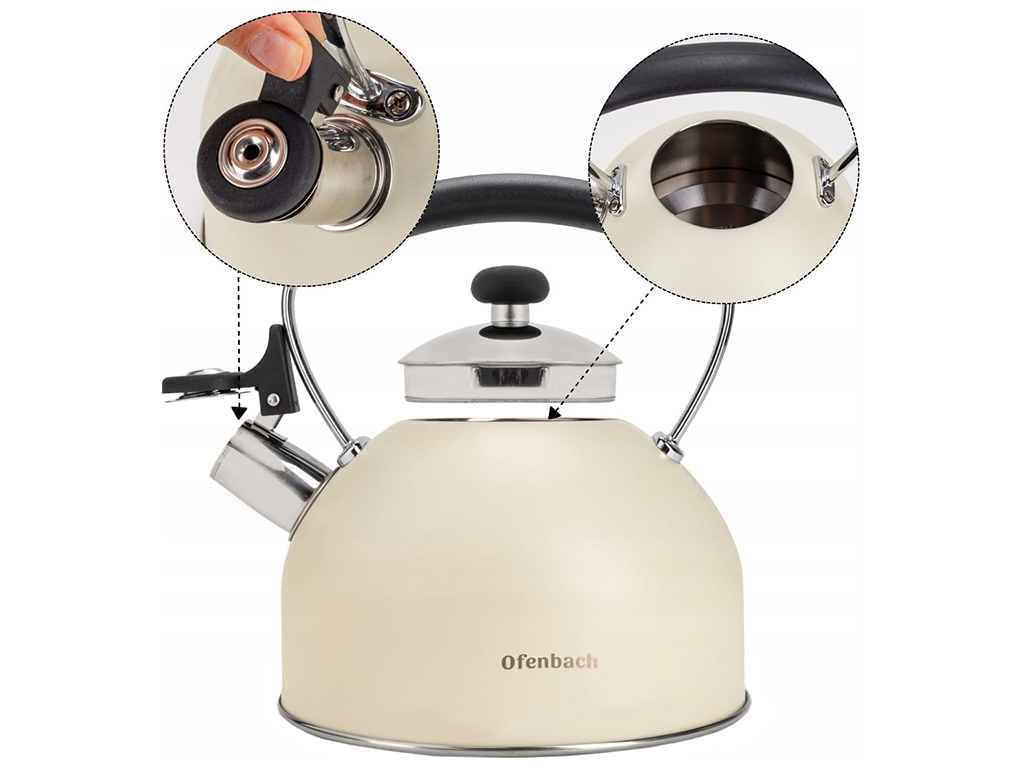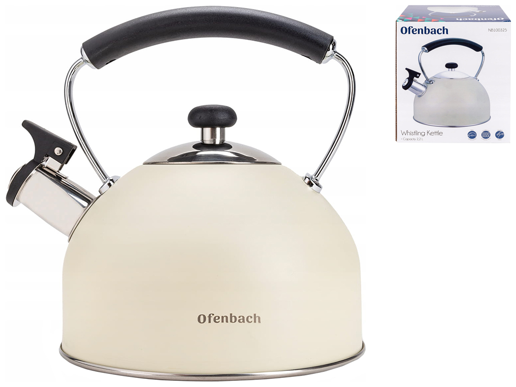 Чайник Ofenbach из нержавеющей стали со стационарным встроенным свистком. Равномерно распределяет тепло и сохраняет его дольше, а свисток сообщит вам, когда вода закипит, экономя энергию. Очень легко поддерживать в чистоте, можно мыть в посудомоечной машине. Позволяет кипятить воду на газовой, электрической, керамической и индукционной плите. Объем: 2,2л. Цвет: бежевый.
