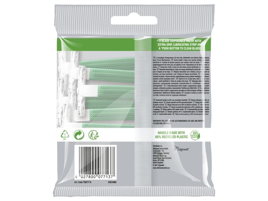 Одноразовые станки Wilkinson Sword Extra 2 Essential Sensitive предназначены для комфортного и мягкого бритья. Каждый станок оснащен двумя лезвиями с дополнительным захватом и увлажняющей полоской с экстрактом алоэ и витамина E. Смазочная полоска обеспечивает дополнительное увлажнение кожи, а кнопка для чистки лезвий облегчает уход за станком. Ручка выполнена из пластика с 65% переработанных материалов и обладает хорошим захватом.
