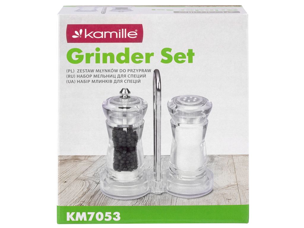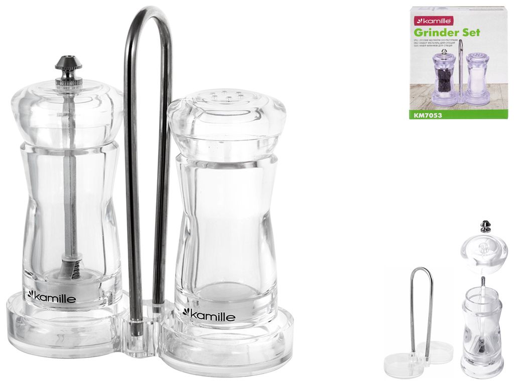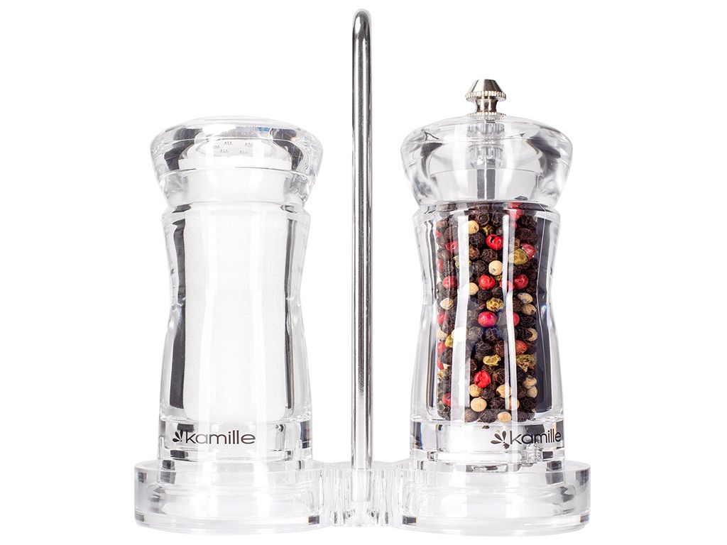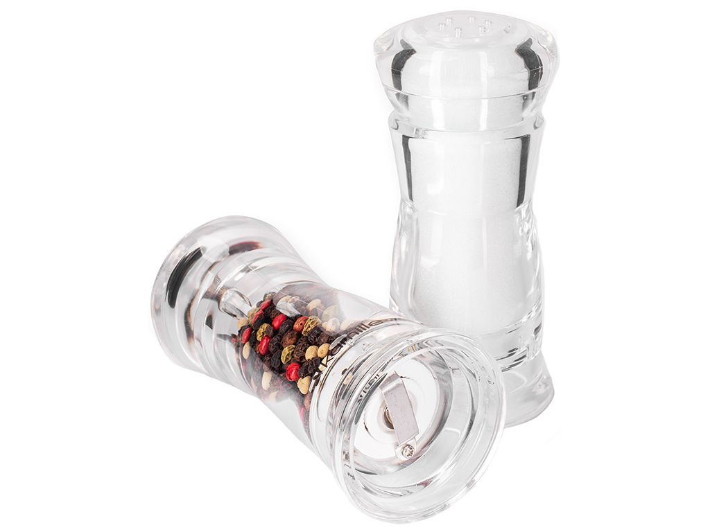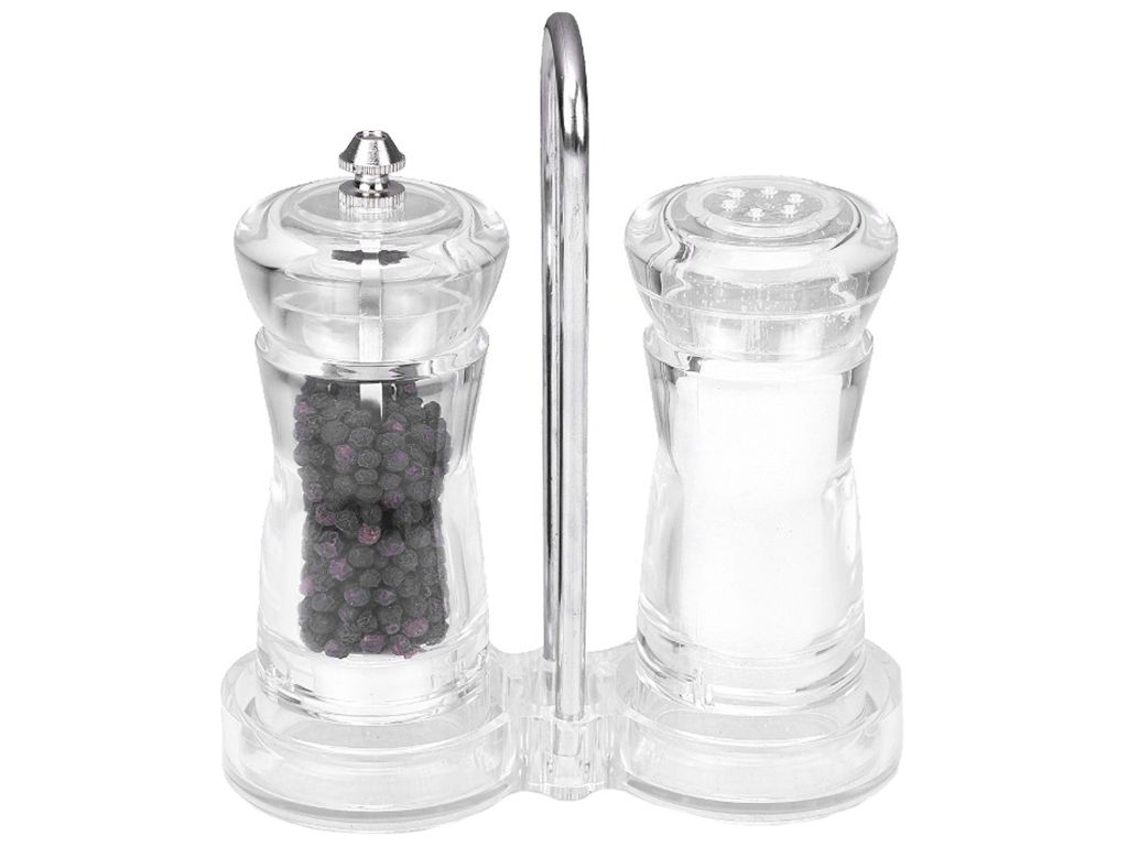 Материал: акрил, нержавеющая сталь. Количество емкостей: 2 шт. Комплектация: мельница, солонка, подставка.