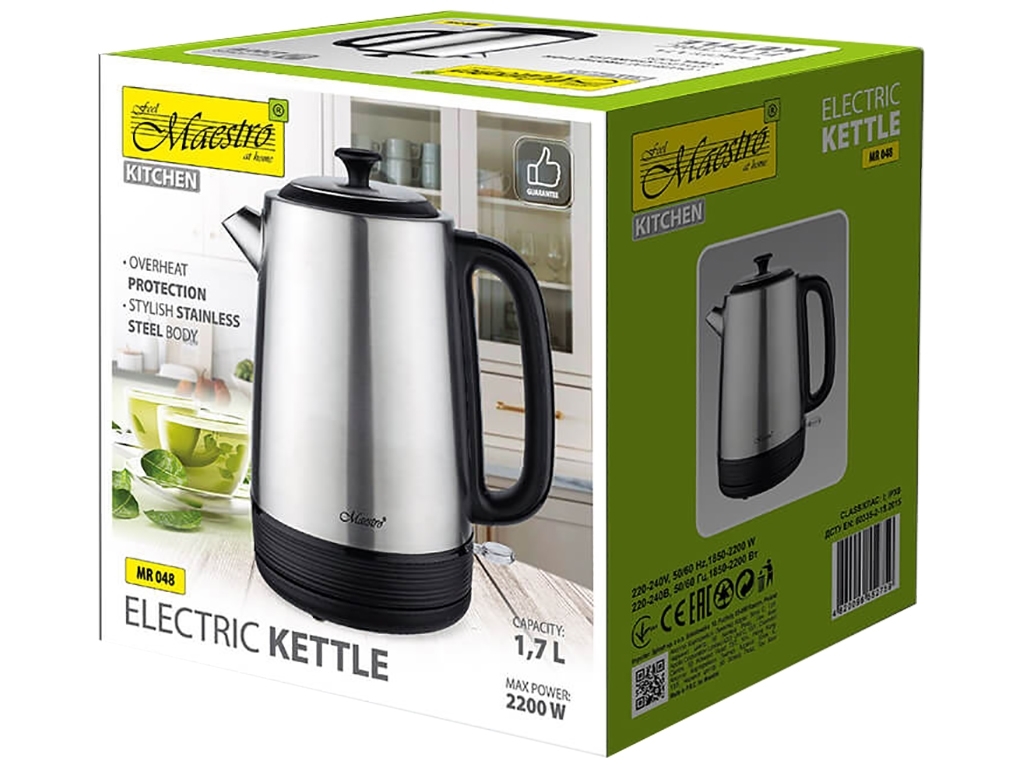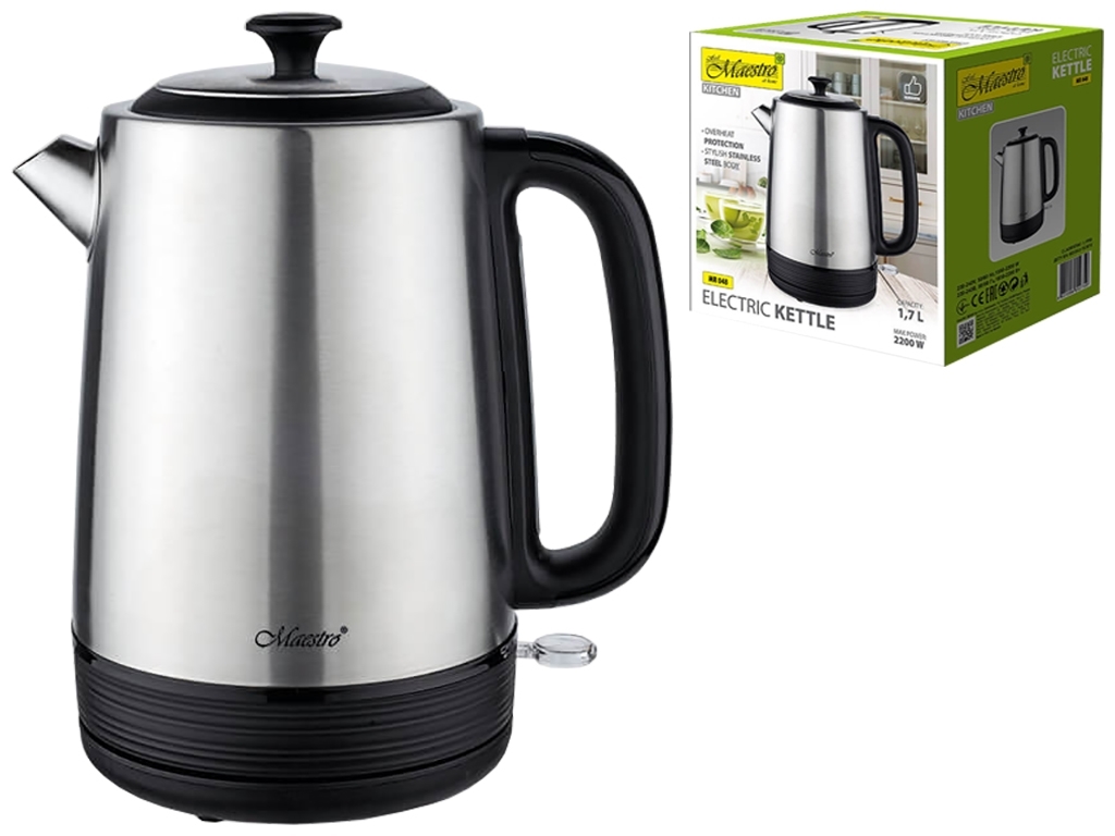 Чайник электрический Maestro. Объем: 1,7л. Мощность: 220-240В, ~50Гц, 1850-2200Вт. Современный эргономичный дизайн. Стильный корпус из нержавеющей стали. Фильтр. Индикатор уровня воды. Вращающийся на 360 градусов корпус. Защитная система от включения без воды. Защита от перегрева. Упаковка: картонная коробка. Для осуществления гарантийного ремонта или обмена необходимо сохранить накладную, гарантийный талон с печатью и коробку. Гарантия 12 месяцев.