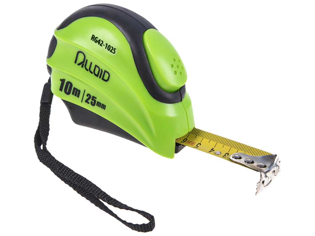 Длина полотна 10м. Ширина полотна 25мм. Рулетка стальная Alloid с автоматической блокировкой сматывания ленты. Двойное лаковое покрытие защищает ленту от истирания. Эргономичная форма корпуса обеспечивает удобный и крепкий захват, а антискользящий материал обеспечивает комфорт и безопасность во время работы. Тип рулетка измерительная. Используется для измерения длины. Тип корпуса двухкомпонентный. Материал пластик, резиновое покрытие. Материал полотна металл. Покрытие полотна нейлоновое (максимально износостойкое). Механизм сматывания с возвратной пружиной. Фиксация ленты — автоматическая. Форма полотна выгнутая. Шкала измерения односторонняя. Вытяжные концы с прямоугольным торцом. Ремешок для руки. Магнит. Единицы измерения метрическая система. Стальная скоба для подвешивания рулетки. Вогнутая форма полотна рулетки придает большую стойкость к излому, что полезно при измерении больших расстояний одним человеком