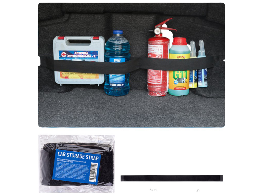 Багажник часто превращается в хаотичное хранилище: аптечка на одном боку, огнетушитель катается по полу, канистра с жидкостью норовит упасть. Чтобы этого не происходило, на помощь приходит ремень-органайзер. Он фиксируется липучкой на обшивке и удерживает предметы в двух широких отделениях. Эластичная лента надежно охватывает канистры, бутылки или ящики и удерживает их на месте даже во время резкого торможения или движения по неровной дороге. В отличие от коробок или пластиковых контейнеров, ремень не крадет пространство и не мешает загрузке крупного багажа. Он подходит тем, кто ценит свободное место, но хочет держать мелкие предметы под контролем. При этом изделие легко снять и переставить, если возникает необходимость изменить расположение. По сути, это простой способ поддерживать порядок, который не требует усилий и всегда под рукой. Сравнивая модели, стоит отметить: ремень длиной 80 см с двумя отделениями подходит для более крупных предметов и создает ровный ряд, в то время как органайзеры меньшего формата удобнее для аэрозолей и мелких бутылок. Таким образом, этот вариант выбирают те, кто возит в багажнике огнетушитель, аптечку или объемные емкости с автохимией.