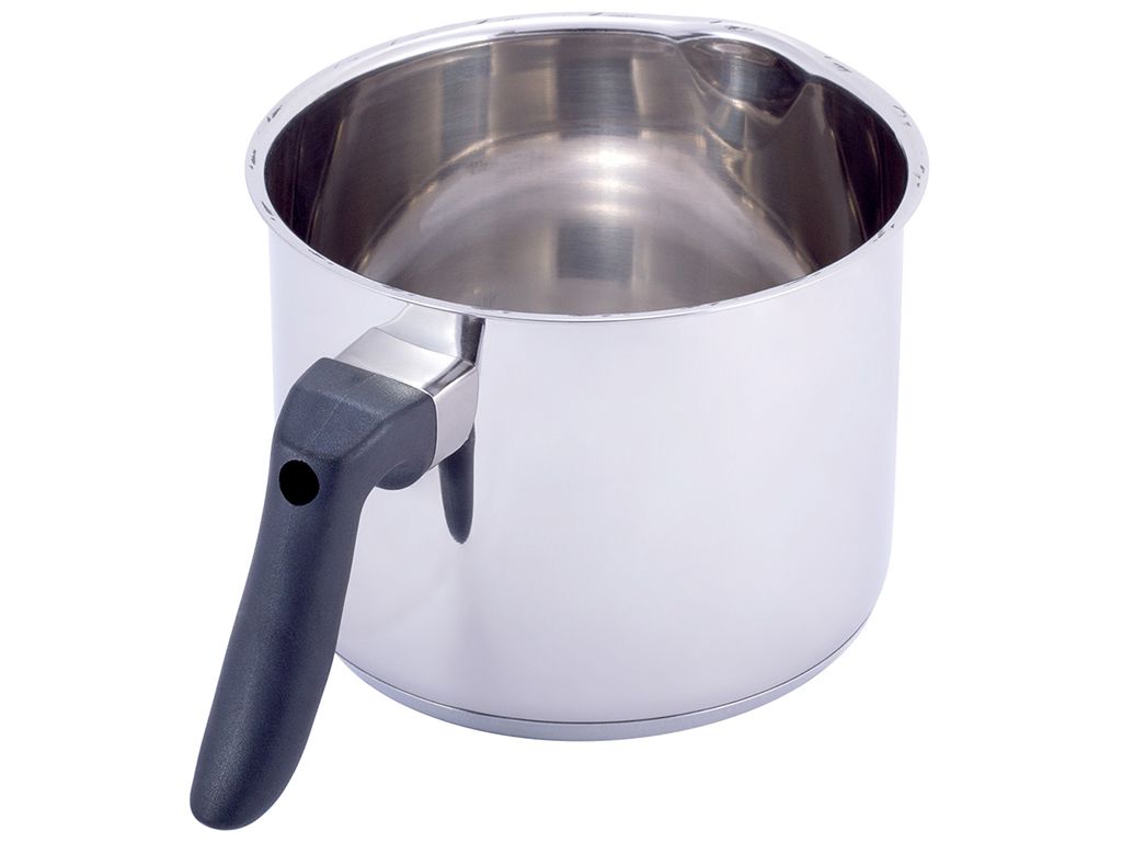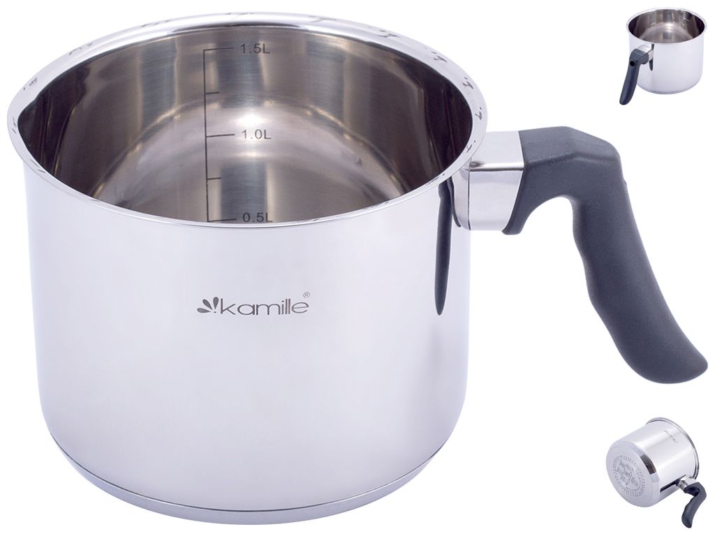 Молочник с бакелитовой ручкой Kamille. Материал: нержавеющая сталь. Крышка: нет. Ручка: бакелит. Размер: 14х11,5см. Объем: 1,5л. Тип дна: капсульное. Мерная шкала: есть. Полировка металла: зеркальная. Тип плиты: электрическая, стеклокерамическая, индукционная, газовая. Подходит для мытья в посудомоечной машине: да. Упаковка: пакет.