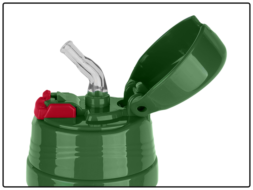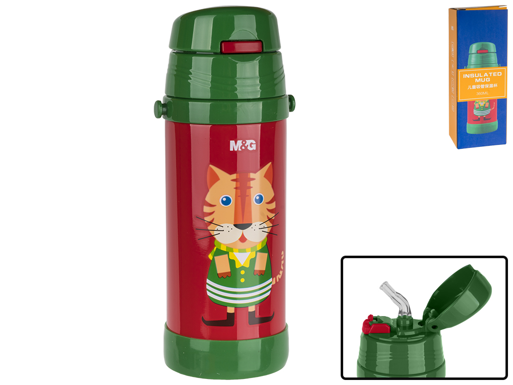 Объем: 350мл. Размер: 7х8,3х25,3см. Диаметр: 7,2см. Материал: нержавеющая сталь (корпус, колба), пластик (крышка), силикон (уплотнитель, трубочка). Цвет: красный с зеленым. Длина трубочки 14см. Винтовая крышка с откидной крышкой на кнопке-замке. Съемный тканевой ремешок крепится к крышке петлей. Термос герметичен и имеет удобную поилку. Простота в очистке и уходе. Изолированный - вакуумный сосуд. Поставляется в коробке 7,5х7,5х21см.