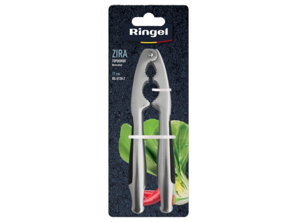 Ручной орехокол предназначен для раскалывания скорлупы грецких, лесных, макадамии и других твердых орехов. Рабочая часть имеет два уровня углубления с насечками – для удобного содержания как крупных, так и мелких плодов. Нажатие осуществляется с помощью двух рычагов, смыкающихся с минимальным усилием и равномерно передающих давление на скорлупу. Модель Ringel Zira изготовлена из цинкового сплава, который обеспечивает высокую жесткость и длительную стойкость к механическим нагрузкам. Ручки имеют эргономичную форму с нескользким покрытием для безопасного захвата даже при влажных руках. Конструкция не имеет дополнительных пружин или разборных узлов, поэтому удобна в очистке: после использования достаточно промыть орехокол под проточной водой и высушить. Благодаря универсальной форме изделие также подходит для вскрытия бутылок с металлическими колпачками.