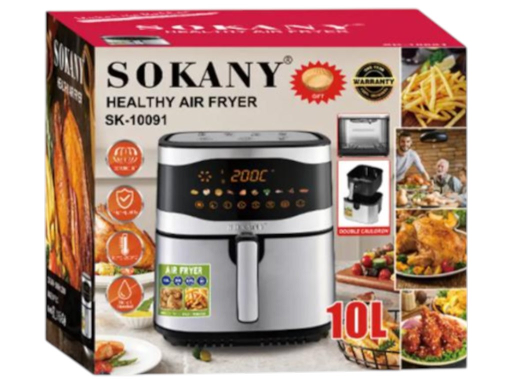 Аэрофритюрница Sokany, 2200Вт, сенсорное управление, 9 программ, 10л, цвет сталь с черным