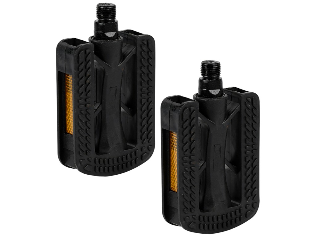 Педали предназначены для установки на велосипеды разных типов — городские, горные и прогулочные. Корпус выполнен из прочного пластика, устойчивого к влаге, пыли и механическим нагрузкам. Поверхность рифлёная, с упорами по краям, что способствует надёжному сцеплению с обувью во время движения. По бокам расположены светоотражающие вставки, повышающие видимость велосипеда при вечерних поездках. Ось металлическая, стандартного размера, подходит под типовую резьбу шатунов. Педали вращаются плавно, без люфта и шума, форма корпуса рассчитана на устойчивое положение ноги. Конструкция выдерживает длительное использование и подходит для замены штатных педалей без необходимости дополнительной регулировки. После поездки изделие легко очищается мягкой тканью от грязи и влаги. Комплект состоит из двух педалей, упакованных в плёнку ПВХ.