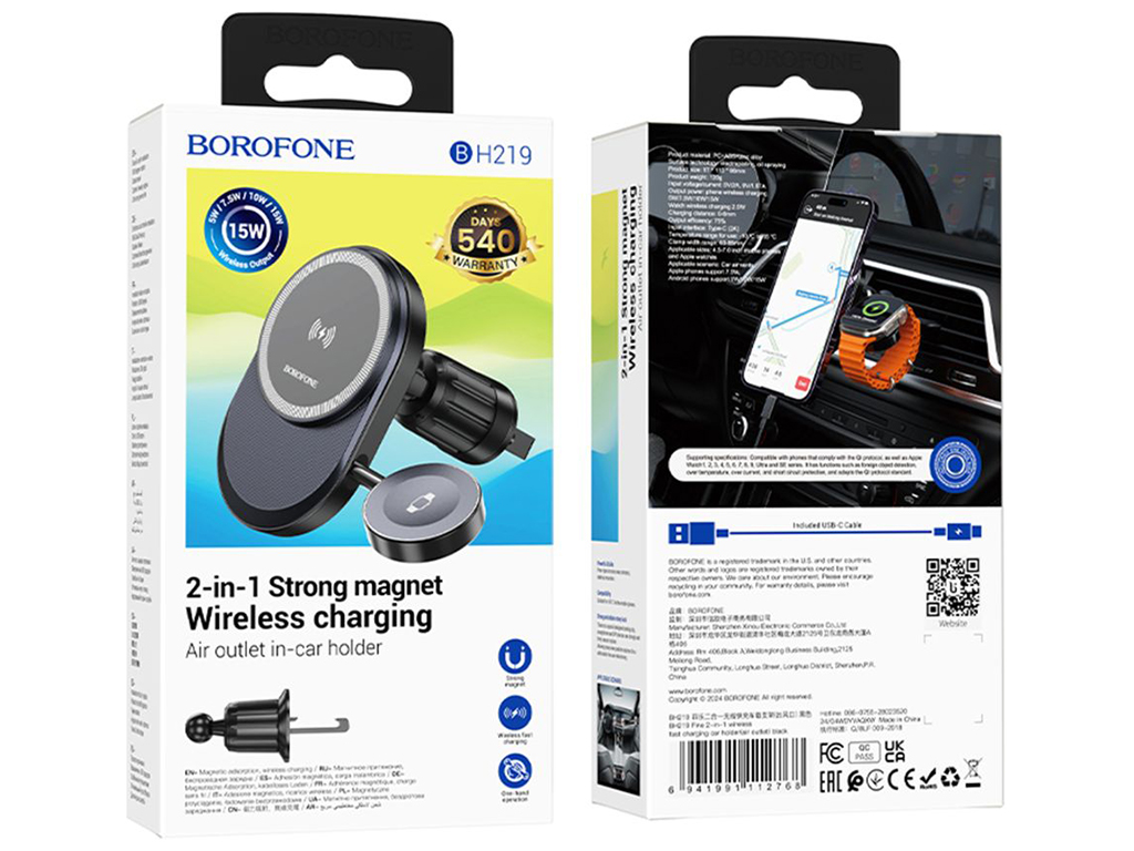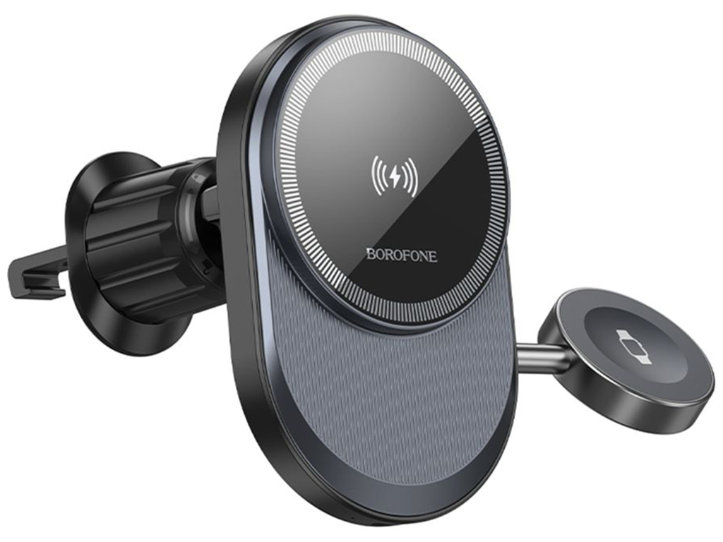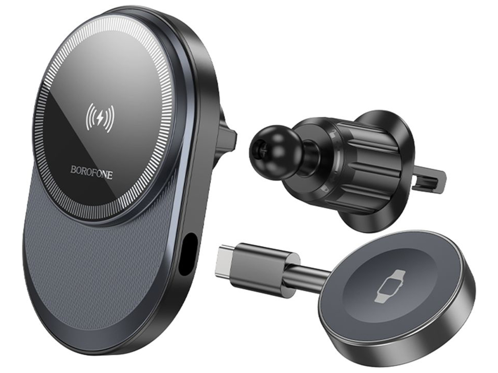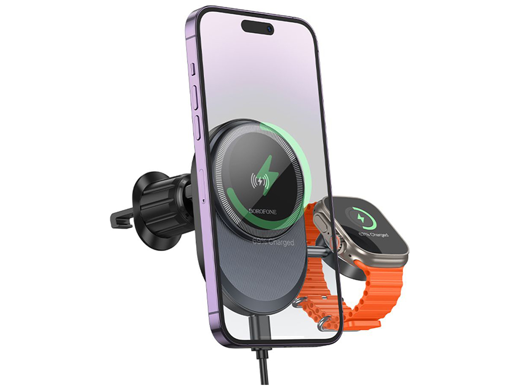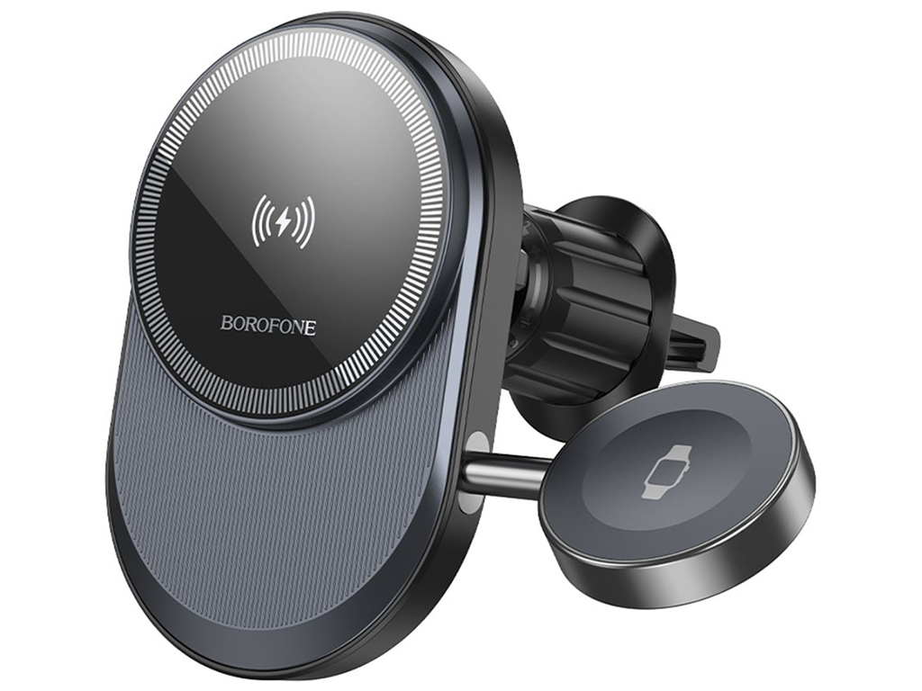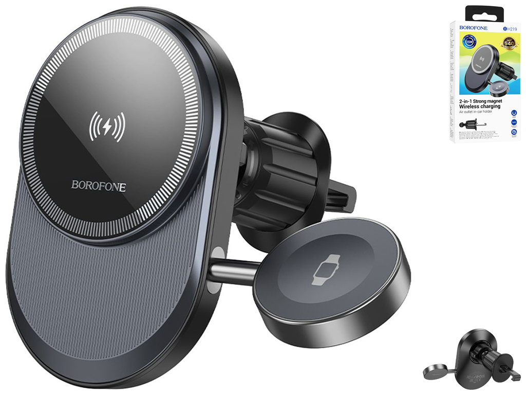 Автодержатель Borofone BH219 с функцией одновременной беспроводной зарядки двух гаджетов: смартфона и iWatch. Компактные размеры (97х113х96мм) и небольшой вес (всего 120г). Мощные магниты, которые гарантируют надежную фиксацию смартфонов с диагональю экрана 4.5-7.0". Шарнирное соединение для настройки наиболее удобного угла обзора экрана. Усовершенствованное крепление, выполненное в виде крюка для установки на вентиляционную решетку. Беспроводная зарядка для смартфонов, которые поддерживают технологии Qi и MagSafe. Широкая вариативность выходной мощности: 5, 7.5, 10 и 15W. Съемный магнитный адаптер для беспроводной зарядки iWatch 1-9, SE/SE2, Ultra/Ultra2 с мощностью 2.5W. Современный разъем Type-C для подключения к источнику питания с помощью комплектного USB кабеля. Многоуровневая система защиты от перегрева, перегрузки, короткого замыкания и скачков напряжения. Дополнительное кольцо для усиления магнитного эффекта и обеспечения совместимости со смартфонами без встроенных магнитов.