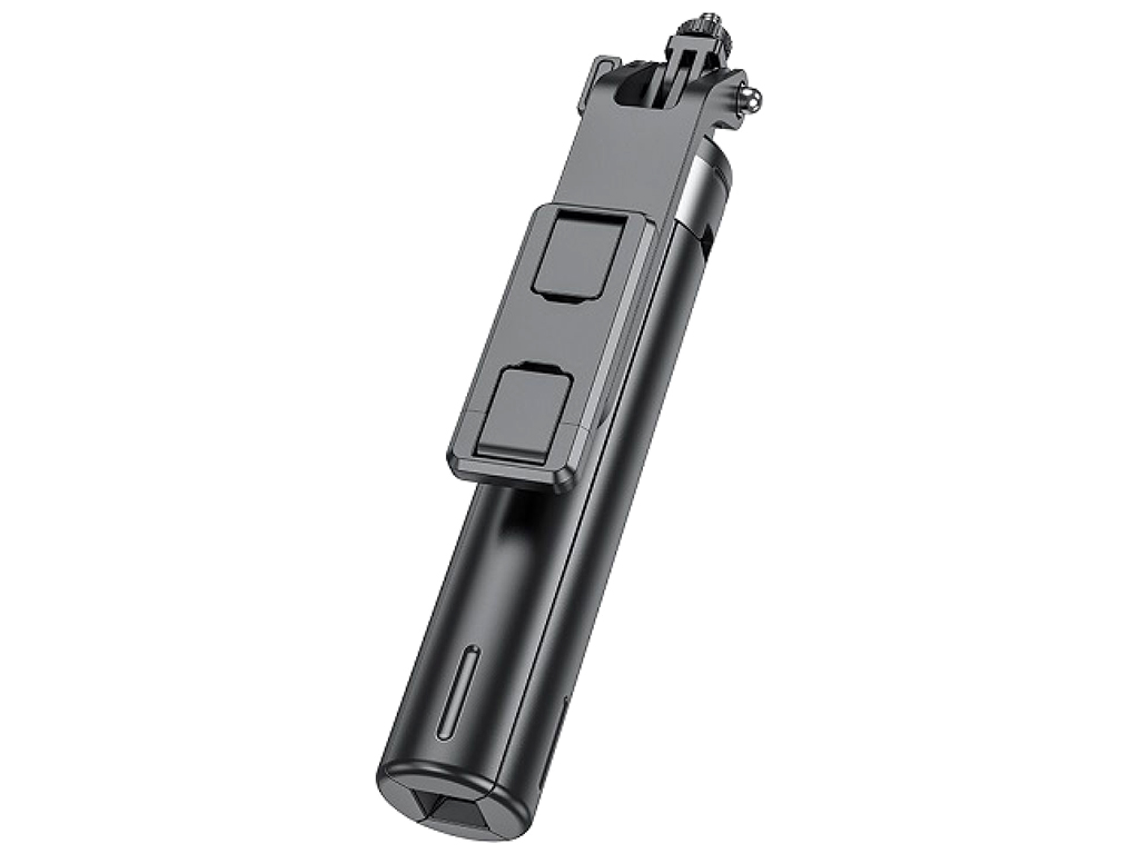 Эргономичная рукоять позволяет легко держать селфи-штатив в руке, может трансформироваться в четыреногу для его устойчивой установки на горизонтальную поверхность. На рукоятке находится слот со съемным пультом ДУ – кнопкой со встроенным модулем Bluetooth V4.2 для удаленного управления съемкой на смартфоне. Кнопка оснащена аккумулятором емкостью 55mAh и разъемом Micro-USB для ее зарядки с помощью комплектного USB кабеля. Тип головки: 3D;