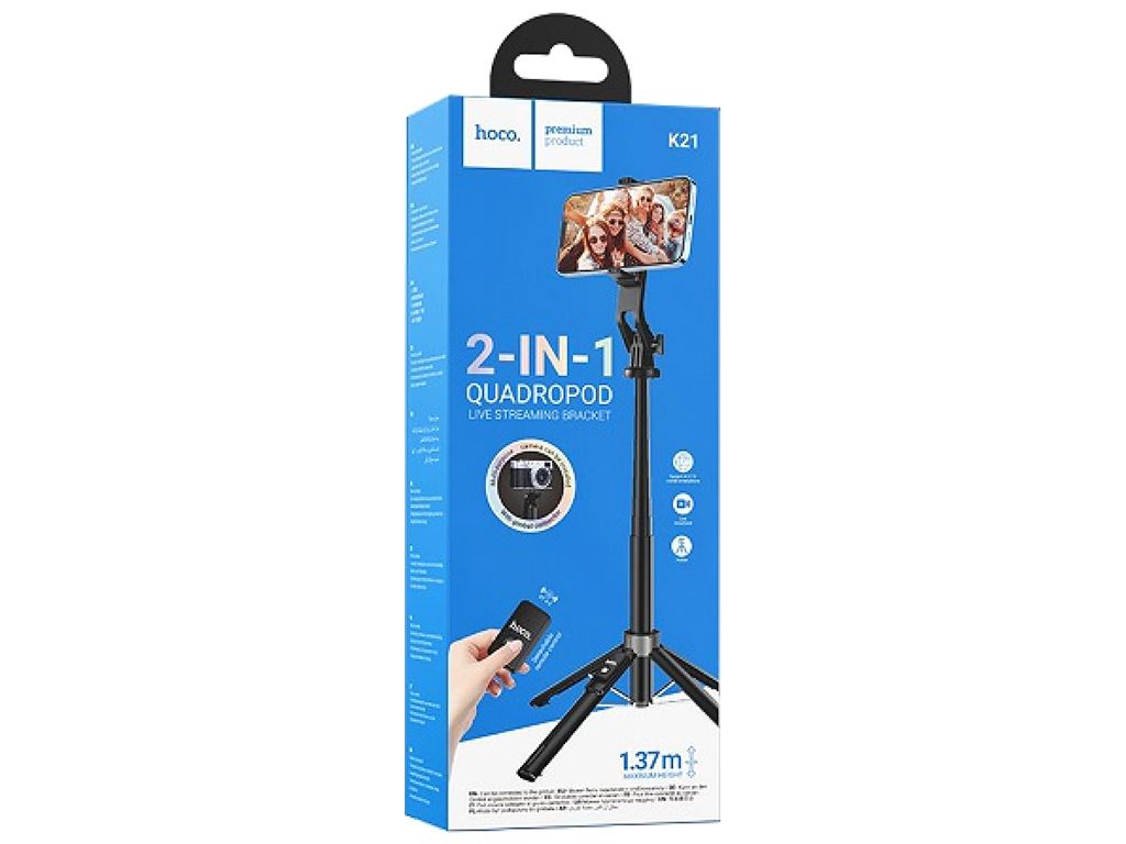 Селфи-штатив Hoco K21 – это универсальный аксессуар, который значительно упростит съемку фото- и видеоконтента на камеру или смартфон, а также повысит его качество. Модель реализована в оригинальном дизайне, имеет практичную складную конструкцию, компактные размеры и небольшой вес. Его можно с удобством можно брать с собой куда угодно, использовать как в помещении, так и вне его для съемки селфи, проведения фотосессий и онлайн трансляций. Аксессуар изготовлен из прочного ABS пластика и алюминиевого сплава, что гарантирует его длительный срок службы и безопасность удерживаемого гаджета. Благодаря телескопическому штативу его длина в полностью разложенном виде составляет 137см, в сложенном – 34см. Универсальный держатель для смартфона с раздвижным механизмом обеспечивает его совместимость со смартфонами диагональю 4.5-7;. Диапазон ширины захвата составляет 62-90см. Одной из его особенностей является наличие стандартного резьбового крепления для фиксации современных камер.