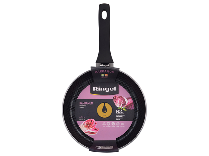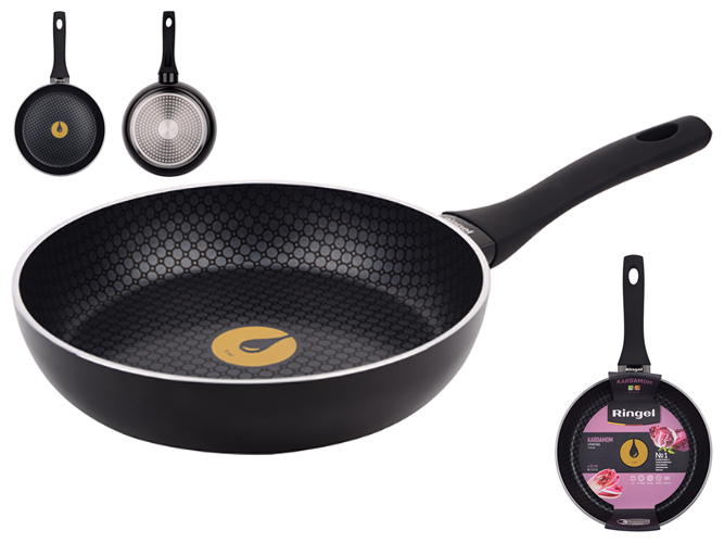 Сковорода Ringel Kardamom, 28см. Материал: высококачественный алюминий. Толщина стенок: 4мм. Высота стенки: 5,7см. Антипригарное покрытие: 3-х слойное антипригарное покрытие с дополнительным рисунком. Наличие крышки: нет. Ненагревающаяся ручка soft touch из термостойкого бакелита. Подходит для всех видов плит, включая индукционные. Можно мыть в посудомоечной машине.