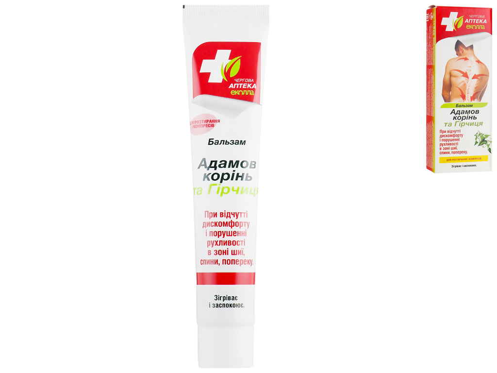 Бальзам Адамов корень и горчица Дежурная Аптека Эколла 50г. Симптомы физического перенапряжения, раздражения и отечности. Средство уменьшит раздражения и снимет отечность кожи, улучшит кровообращение, сократит мышечное напряжение. Благодаря своему натуральному составу, бальзам улучшает подвижность в суставах и позвоночнике, действует согревающе и успокаивающе. В экстрактах адамова корня содержатся гликозиды, дубильные вещества, сапонины, муравьиная и щавелевая кислота, за счет чего бальзам положительно действует при воспалениях суставов, радикулитах, ревматизме и артрите. Экстракт горчицы богат фитонцидами, улучшает циркуляцию крови, снимает отеки и болезненные ощущения. Противовоспалительное действие оказывают эфирные масла пихты и сосны.