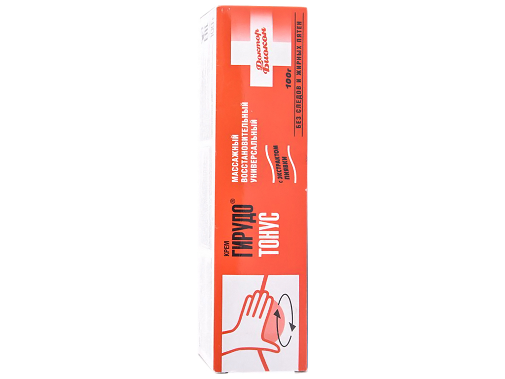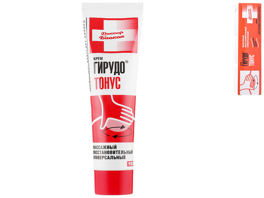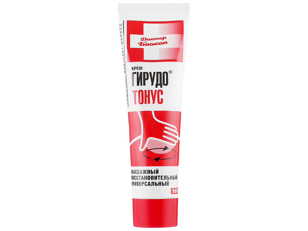 Крем Доктор Биокон Гирудотонус массажный восстанавливающий крем 100г. Показания: малоподвижный образ жизни; состояние после ношения гипсовых повязок; уход за лежачими больными, профилактика пролежней; болезненность мышц после интенсивных нагрузок; после спортивных и других травм (растяжения и ушибы); поддержание тонуса и кровообращения после инсультов, парезов и параличей. Улучшает кровообращение в коже, мышцах, суставах. Увеличивает приток крови и лимфодренаж. Обладает разогревающим действием. Улучшает питание и упругость кожи, предотвращает образование пролежней, улучшает мышечную силу и обьем движений.