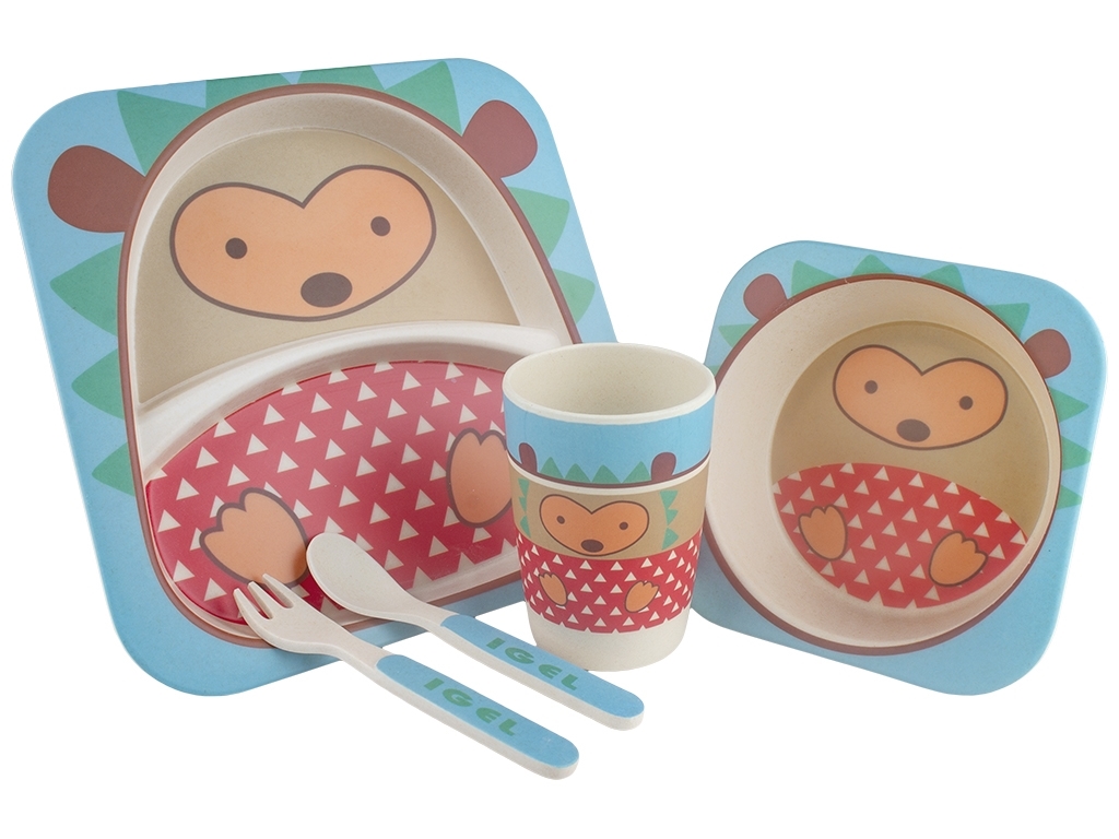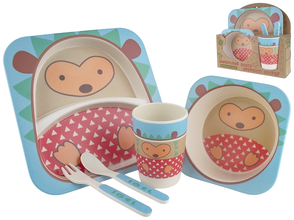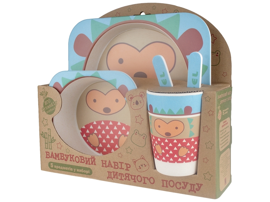 Набор детской бамбуковой посуды 5 предметов Stenson "Ёжик" (2 тарелки, вилка, ложка, стакан)
