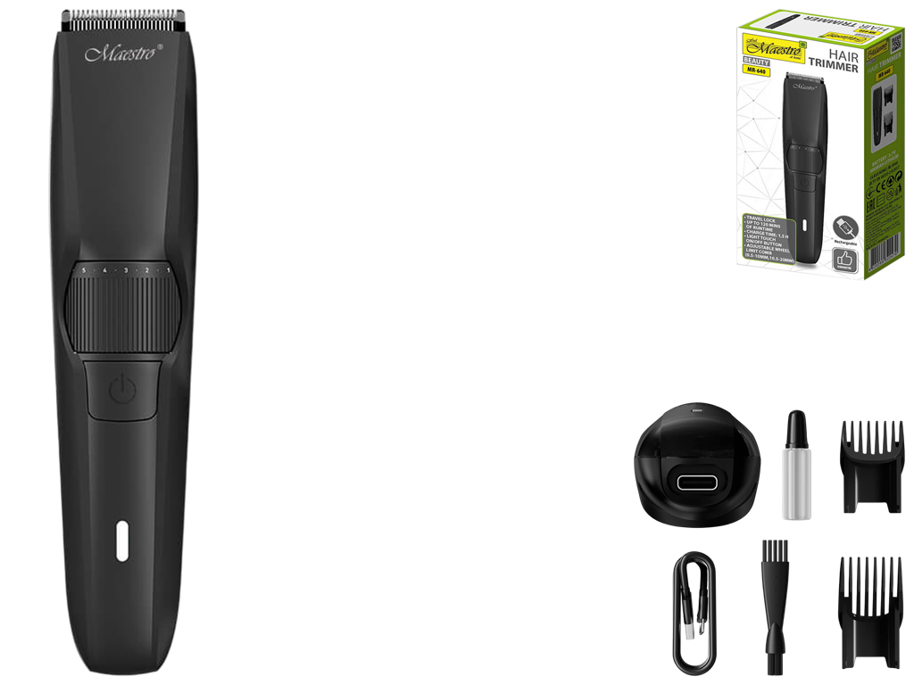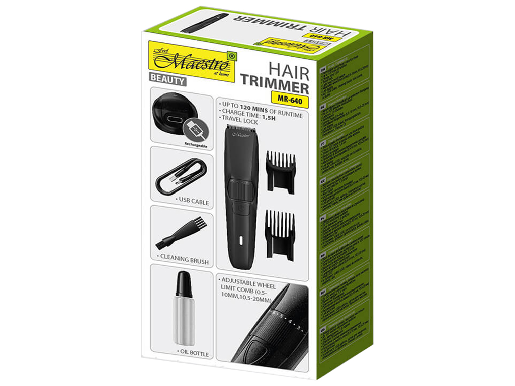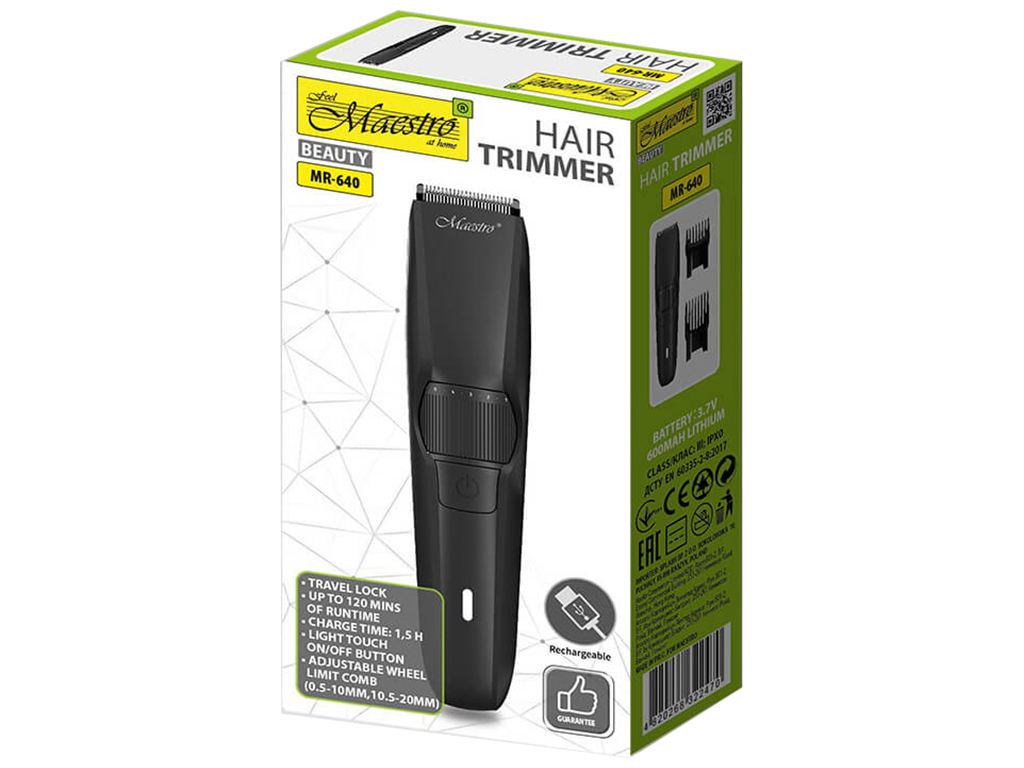 Литиевая батарея: 3,7V 600 мАч. Съемная режущая головка, которая легко чистится. До 120 минут автономной работы. Время зарядки: 1,5 часа. Дорожная блокировка в пути. Сенсорная кнопка включения/выключения. Регулируемая высота лезвия (0,5-10мм, 10,5-20мм). Led дисплей. В комплекте: USB-кабель, щетка для чистки, ограничительная расческа, бутылка с маслом.